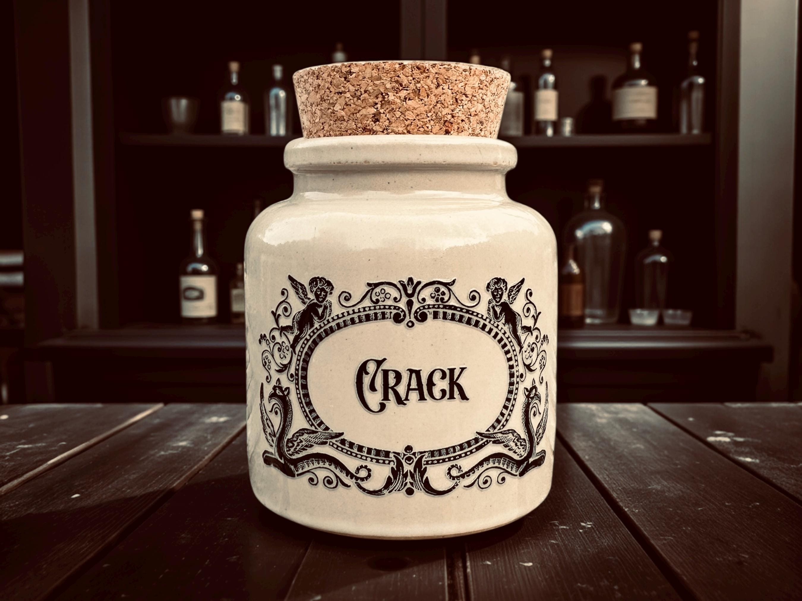 Looking for the perfect little jar to spark concern, confusion, and uncontrollable laughter from every visitor to your bathroom shelf or kitchen counter? Say hello to this altered apothecary jar boldly labelled “CRACK.”