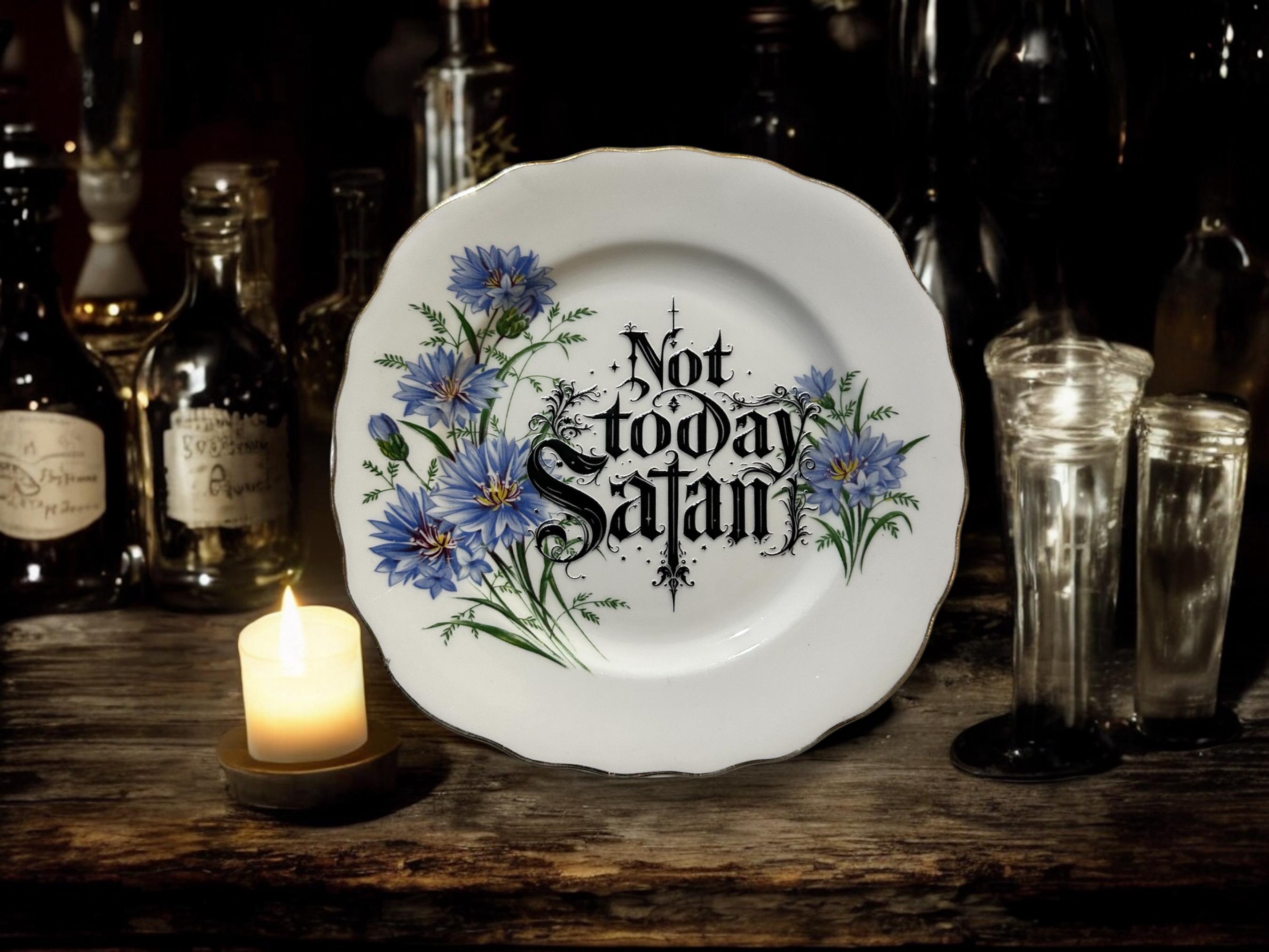 Behold, a dainty 16cm vintage plate whispering sweet blasphemies across the ages. Delicately floral, aggressively sassy, and proudly proclaiming what we all mutter under our breath while ignoring texts, dodging responsibilities, or swerving yet another existential crisis: **Not today, Satan.**