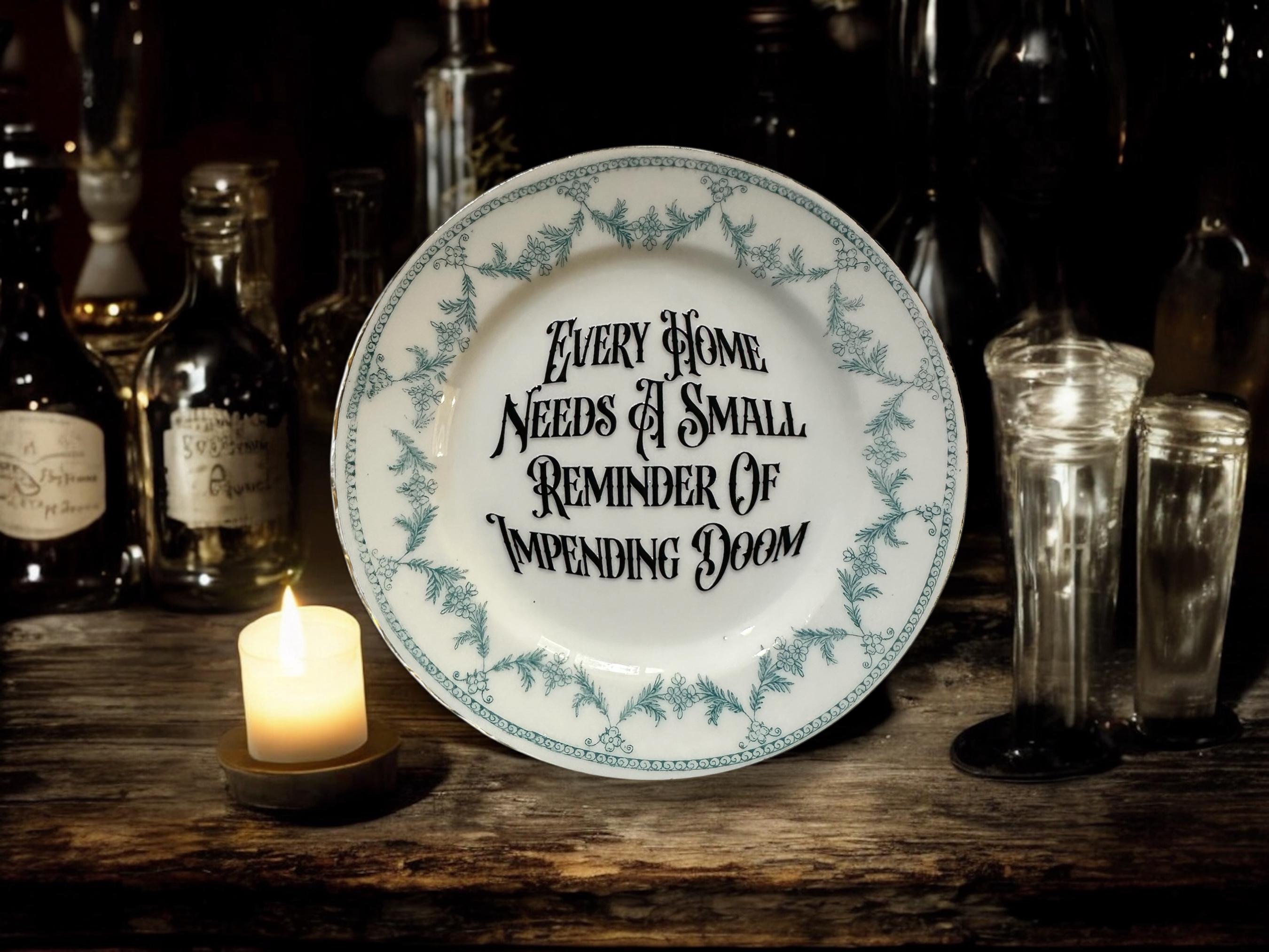 Perch this existential gem on your shelf, mantle, or altar to the Great Cosmic Void — it comes with a free plate stand (because what’s a doom plate without its little throne?). Display it proudly to warn guests that while you do serve tea and biscuits, you also serve brutal honesty about the state of the universe.