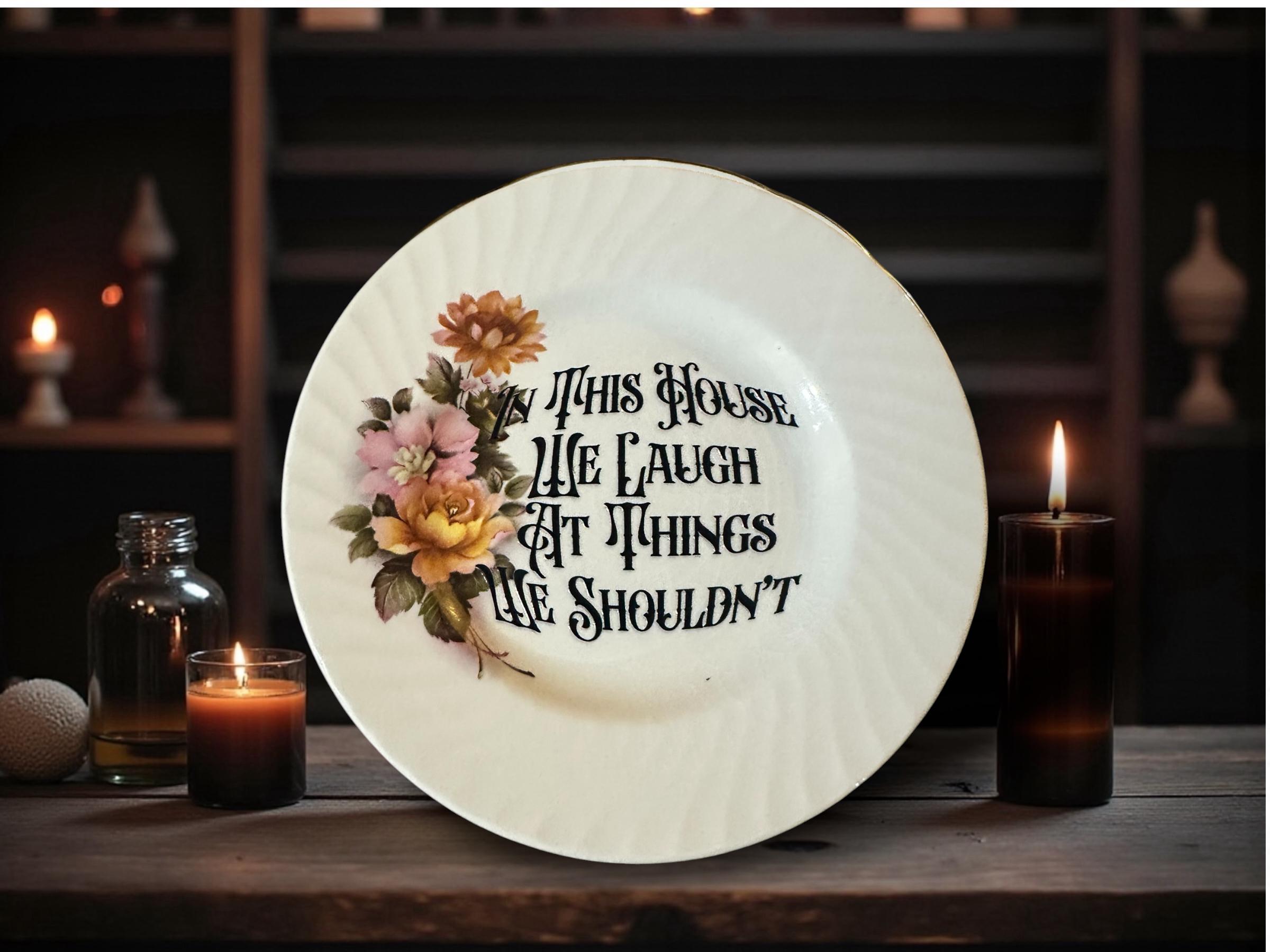 Vintage 16cm Decorative Plate with Stand – “In This House We Laugh At Things We Shouldn’t”