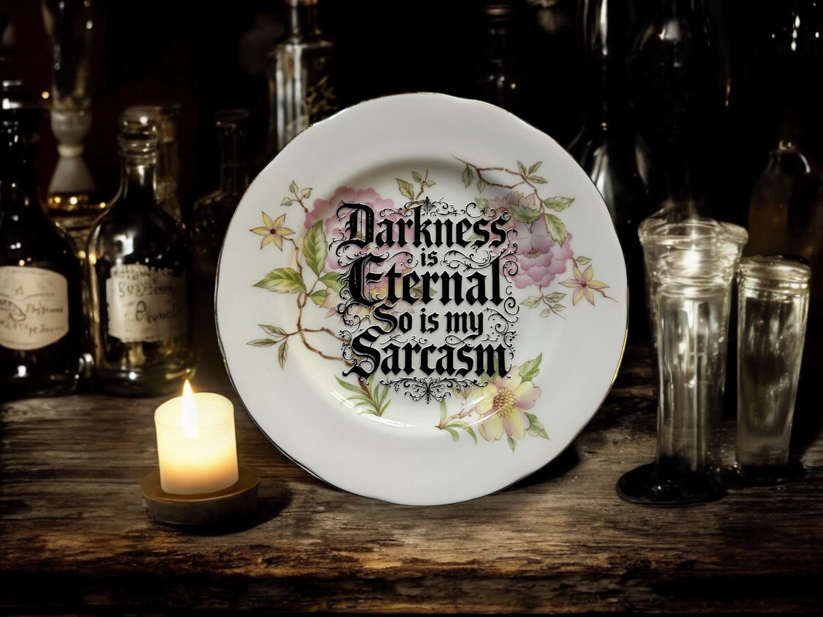 🖤 16cm “Darkness Is Eternal, So Is My Sarcasm” Plate – Vintage Crackpottery 🖤