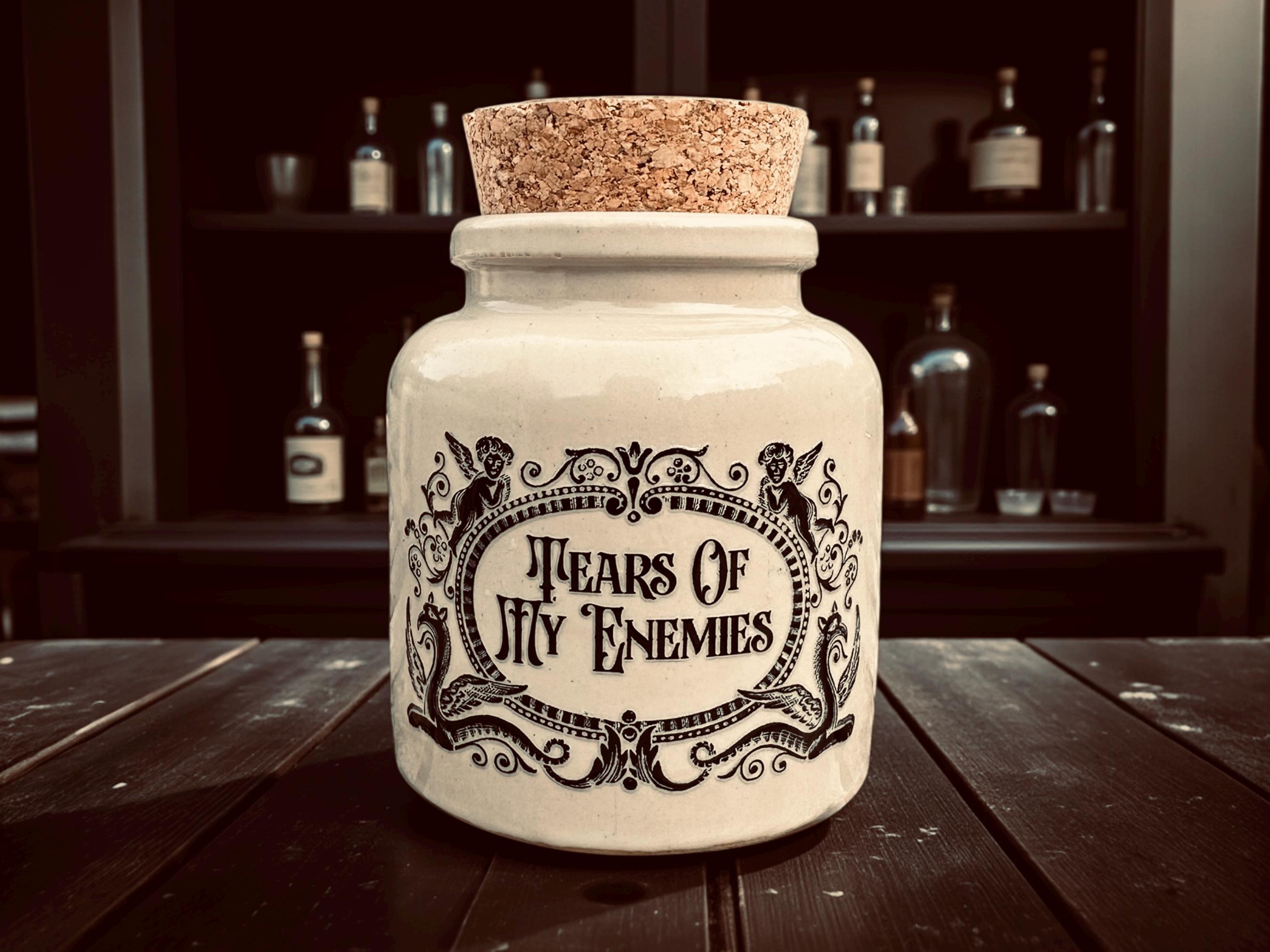 Keep your victories on display and your petty grudges in style. This stoneware apothecary jar is labelled “Tears of My Enemies” in smug black print, ideal for anyone who enjoys a dramatic vignette on the kitchen shelf.