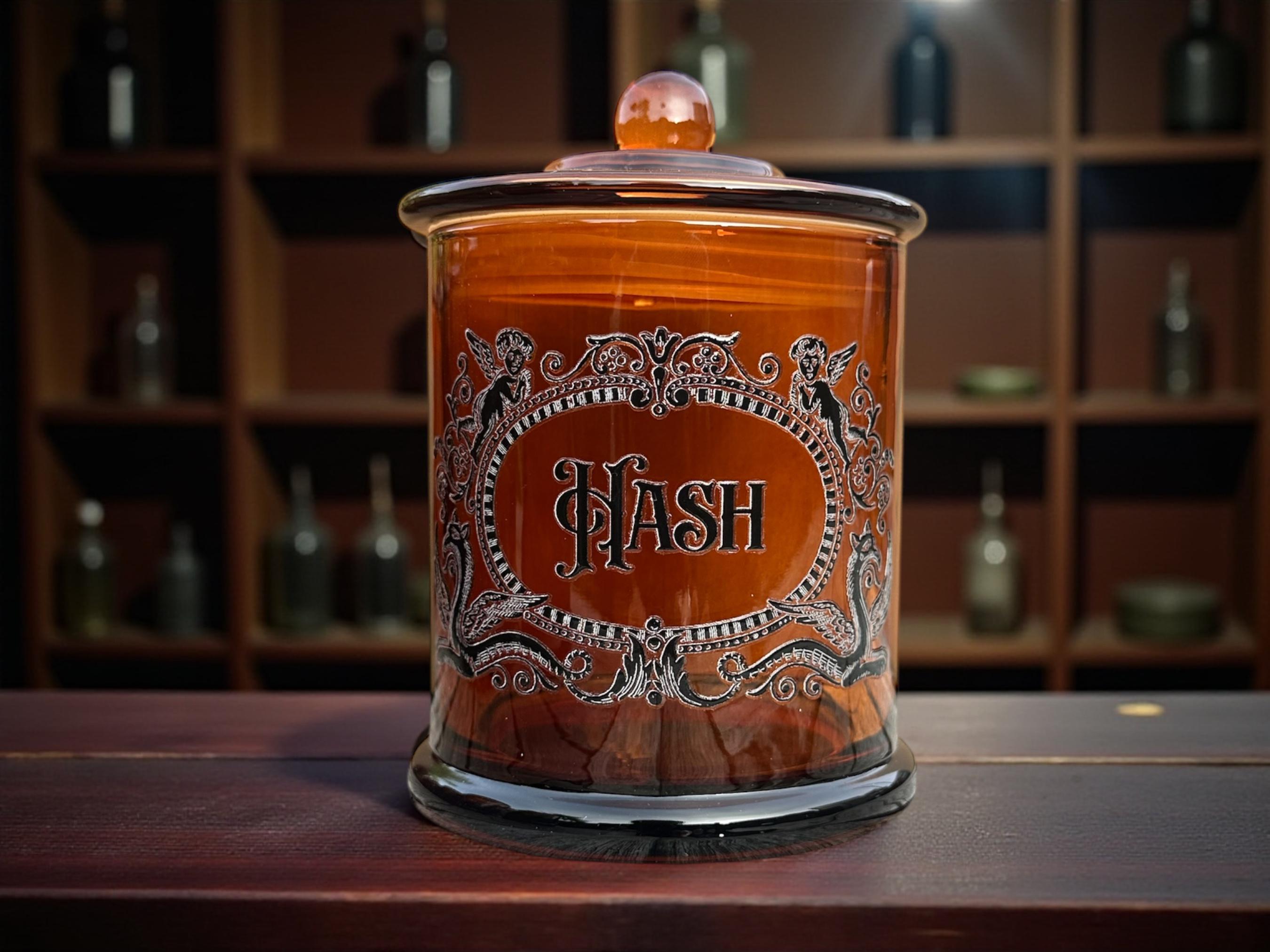 For the mellow mischief-maker with refined taste. This large amber glass apothecary jar is labelled “Hash” in bold black and white print, perfect for herbs, tea, or your favourite calming concoction.