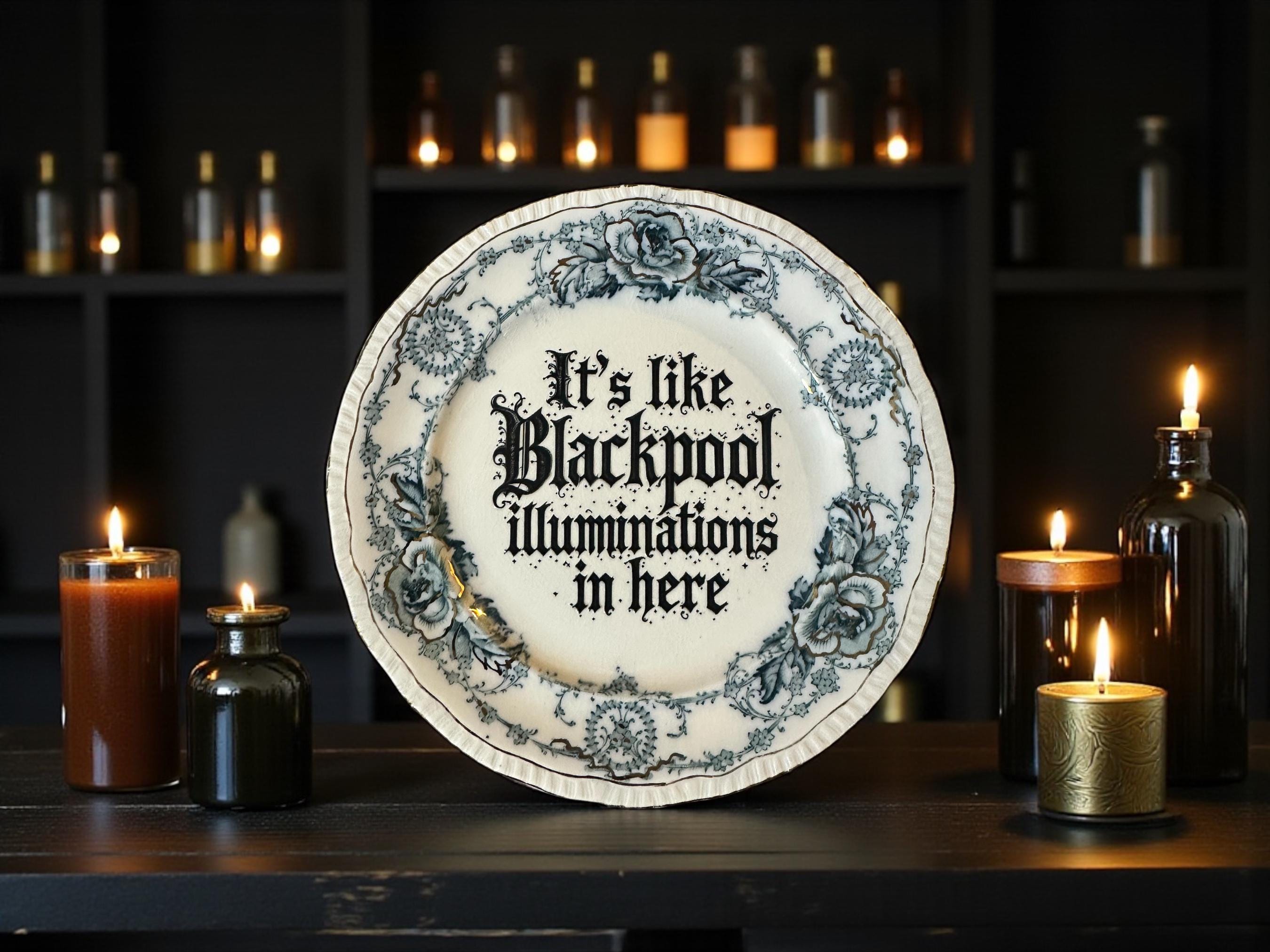 **Tags**: #DadJokes #BlackpoolIlluminations #VintagePlate #FunnyDadDecor #TooManyLights #SassyHomeDecor #TackyChic #HandwashOnly #SarcasticPlate #FunnyChristmasDecor #FamilyDrama #DadComplaints #VintageHumor #ChristmasSass