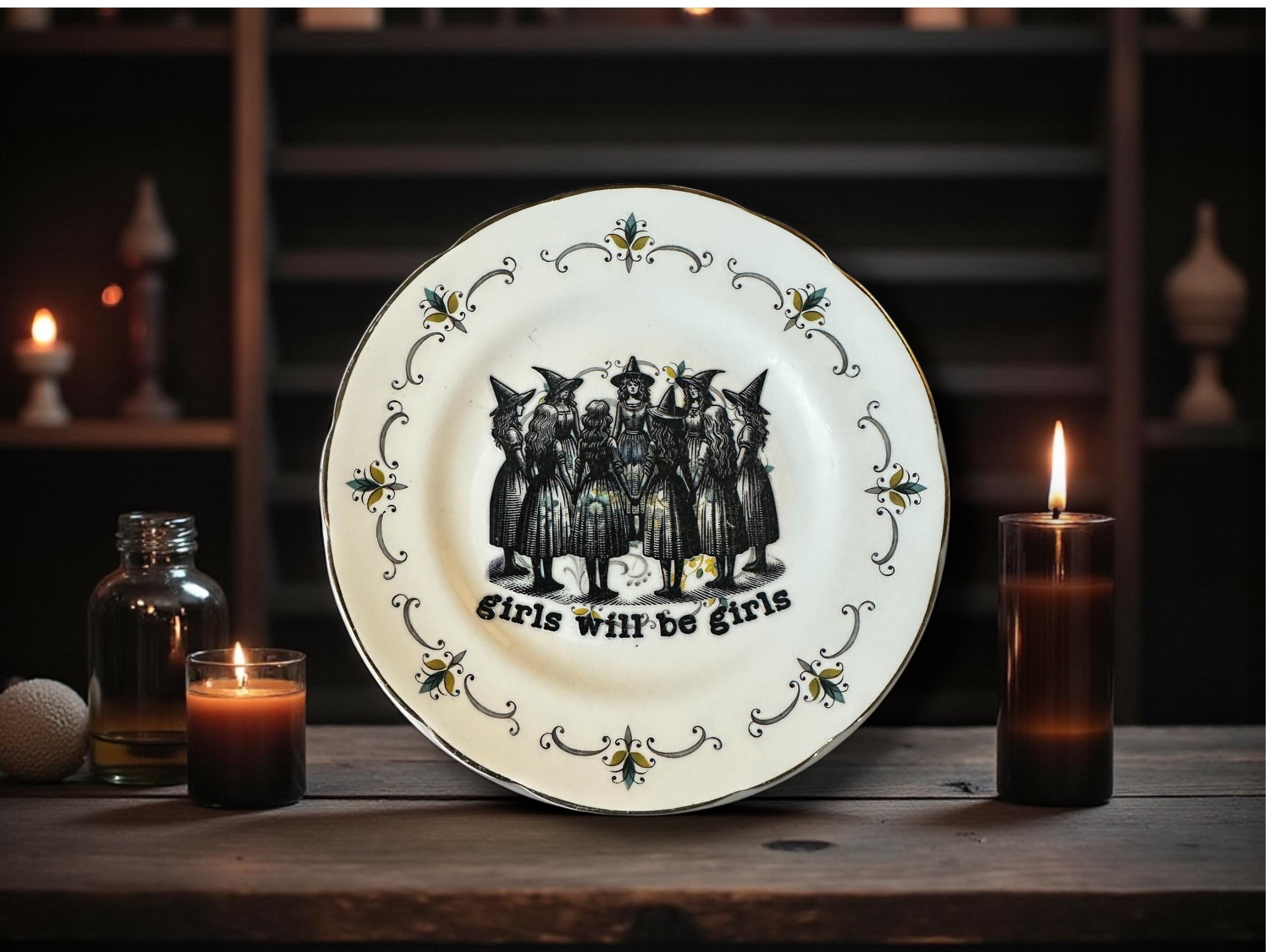 **Vintage "Girls Will Be Girls" Plate – 16cm of Witchy Sass and Magical Mayhem** 🧙‍♀️✨