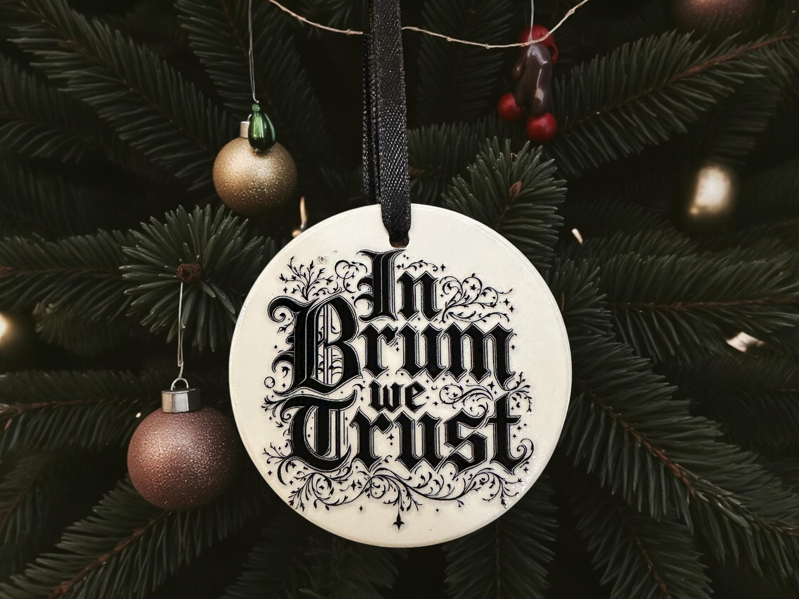 All hail the homeland of cobs, canals, and chaos. This 8cm flat ceramic bauble proudly declares “In Brum We Trust” in bold gothic lettering, finished with a black ribbon for hanging. Perfect for anyone who believes in Birmingham, balti, and bad weather.