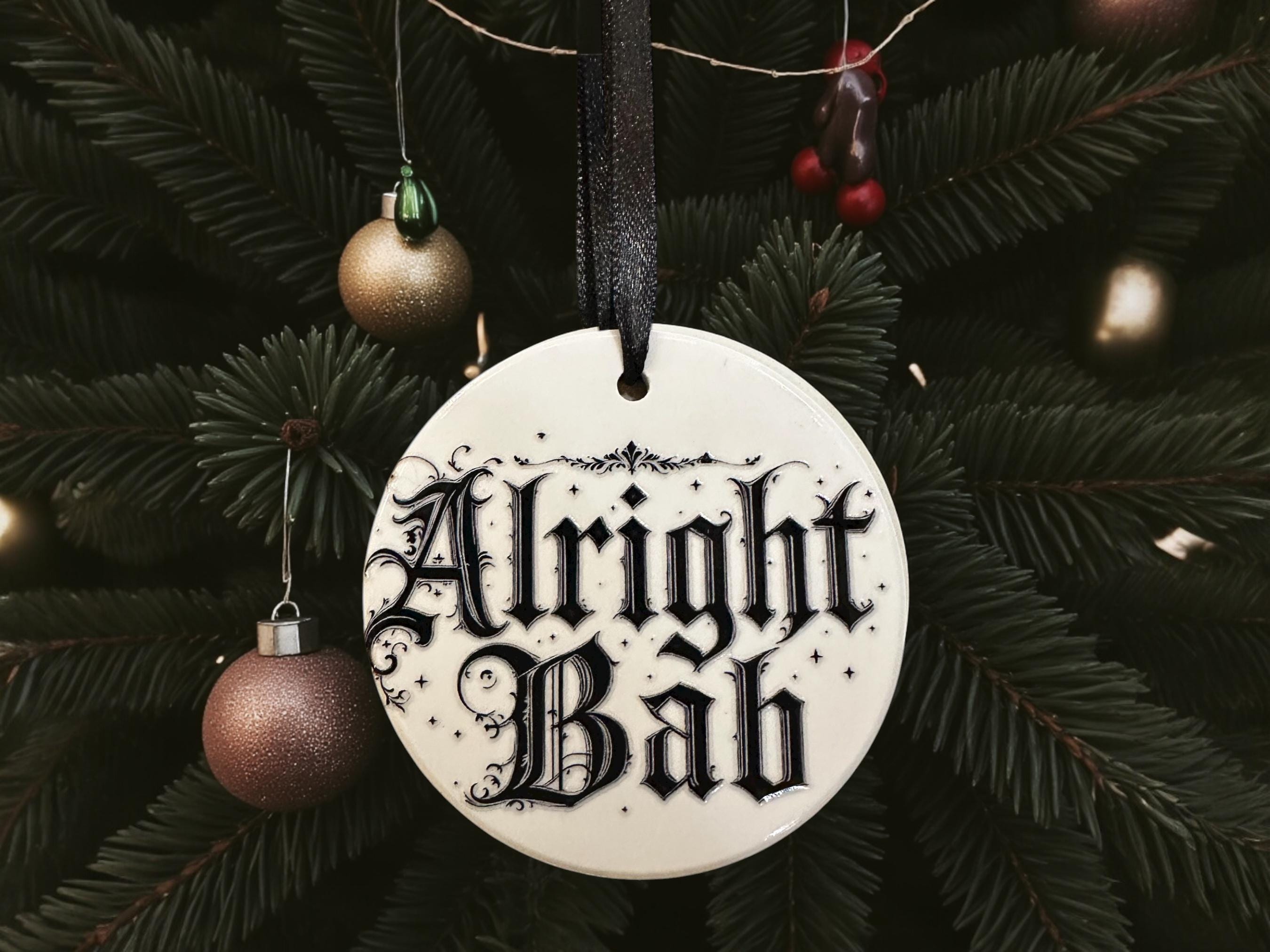 The only acceptable Brummie greeting, now immortalised in festive glory. This 8cm flat ceramic bauble proudly says “Alright Bab” in bold gothic lettering, finished with a black ribbon because gold string is for soft lads. Perfect for any Christmas tree that smells faintly of gravy, sarcasm, and second-hand smoke from the Bullring.