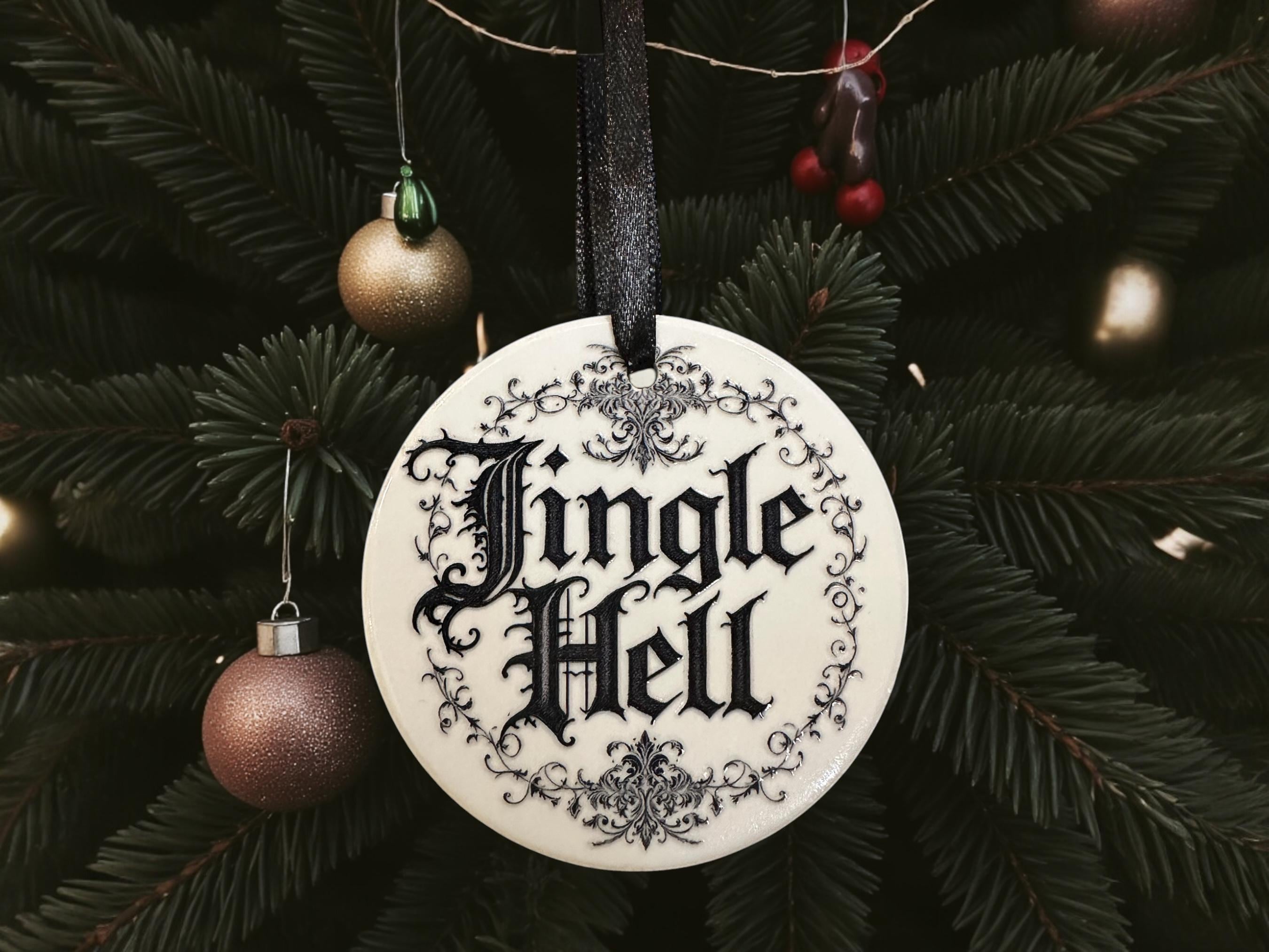 Sleigh bells? No thanks. This 8cm flat ceramic bauble declares “Jingle Hell” in bold gothic lettering, finished with a black ribbon because glitter is the devil’s dandruff. Perfect for anyone whose festive spirit has been replaced by caffeine, sarcasm, and seasonal rage.