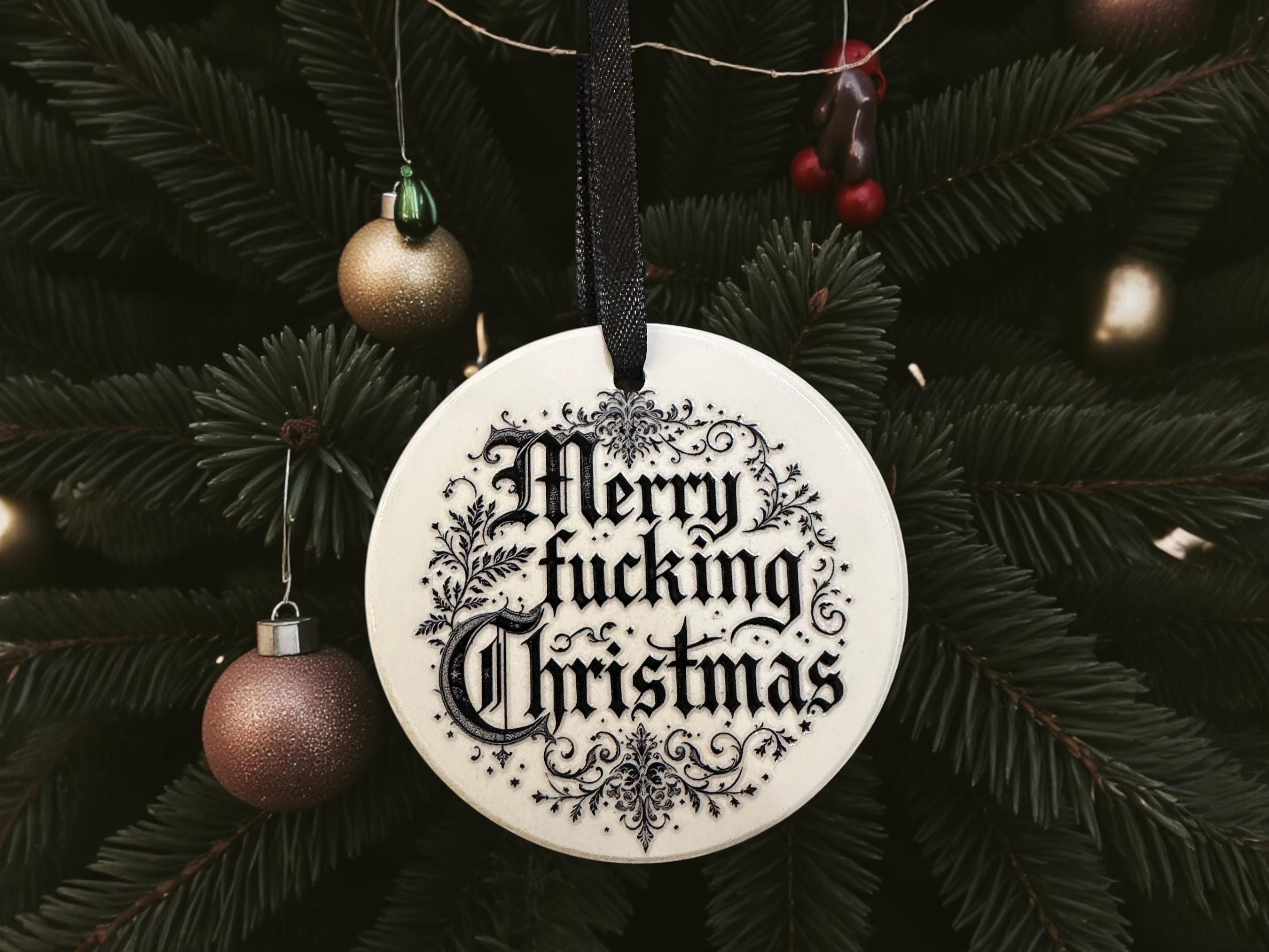 For those who like their festive greetings honest and loud. This 8cm flat ceramic bauble screams “Merry Fucking Christmas” in bold gothic lettering, finished with a black ribbon because subtlety died somewhere between the wrapping paper and the wine. Perfect for anyone who loves Christmas but hates people.