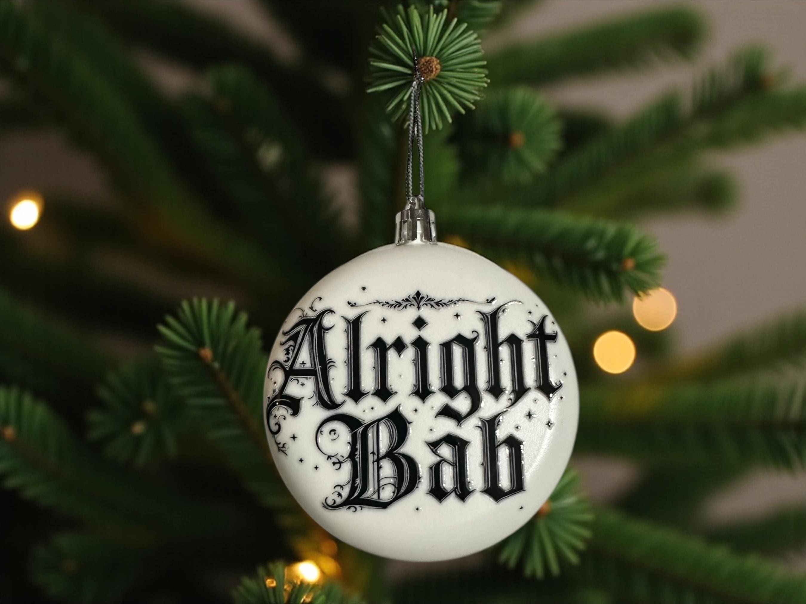 White Acrylic Rounded Christmas Bauble – “Alright Bab”