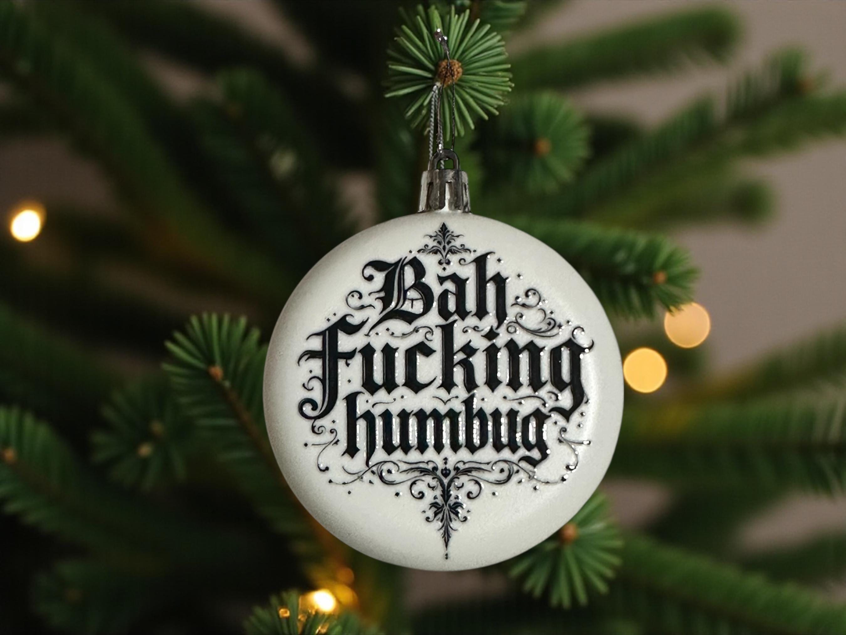 White Acrylic Rounded Christmas Bauble – “Bah Fucking Humbug”