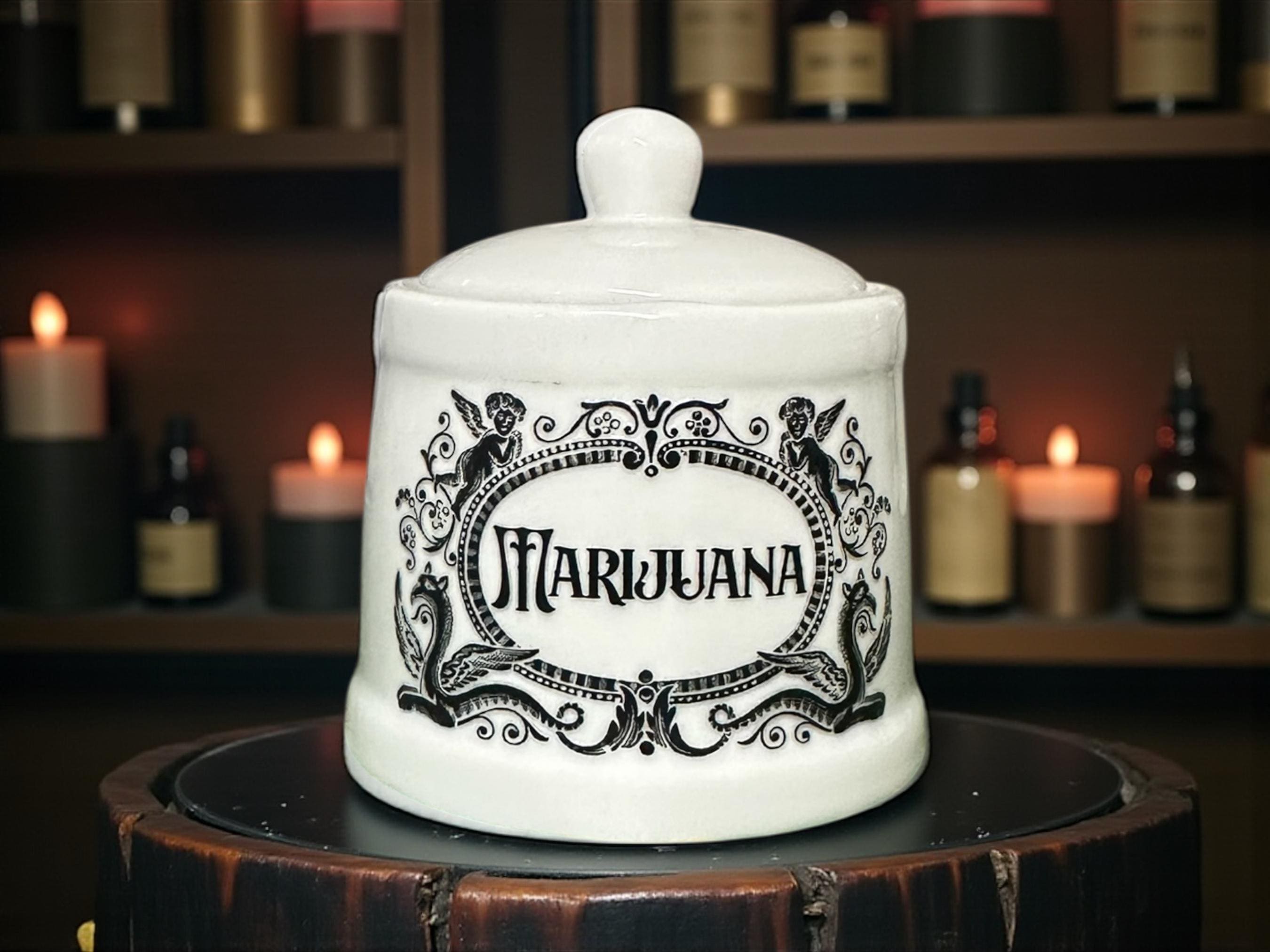 A sweet, innocent looking white ceramic jar doing its absolute best to behave while sporting a label that absolutely does not. Marijuana. Perfect for giving your kitchen that Victorian apothecary meets mildly delinquent vibe.