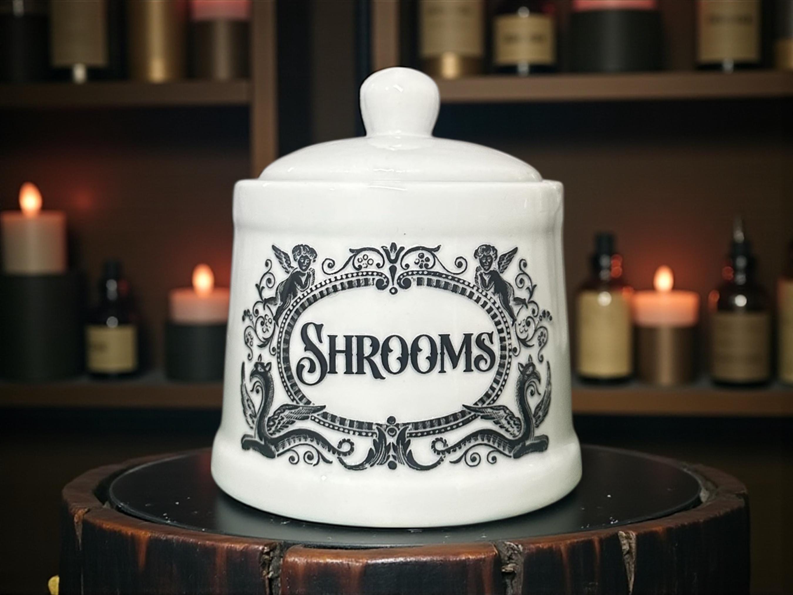 An innocent white ceramic jar doing its best to look respectable while proudly labelled Shrooms. Perfect for that Victorian apothecary meets woodland goblin energy you insist on bringing into the kitchen.