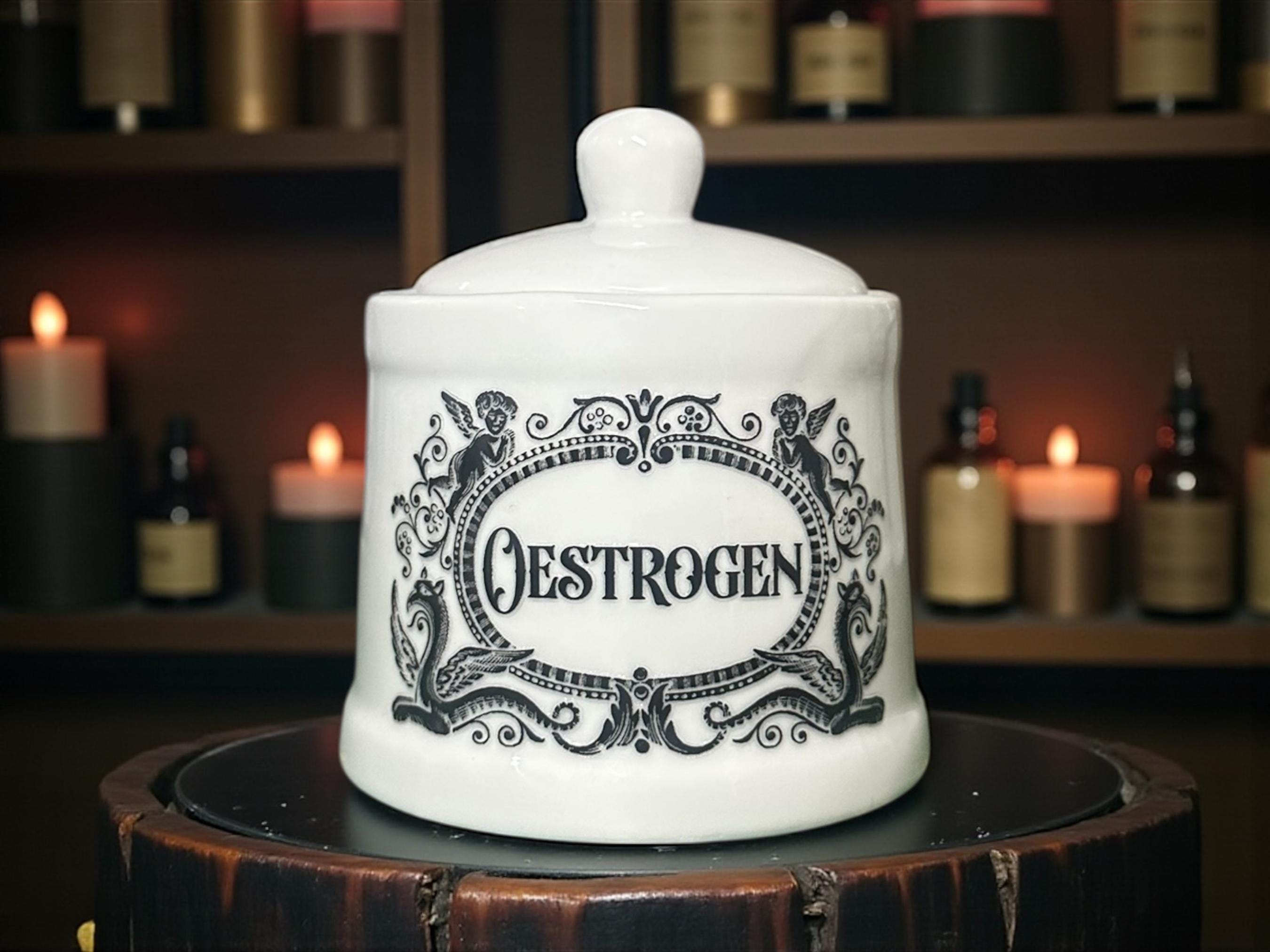 A sweet, innocent white ceramic jar doing its absolute best to look respectable while sporting a label that says otherwise. Oestrogen. Perfect for anyone whose kitchen aesthetic is Victorian apothecary meets hormonal rollercoaster.