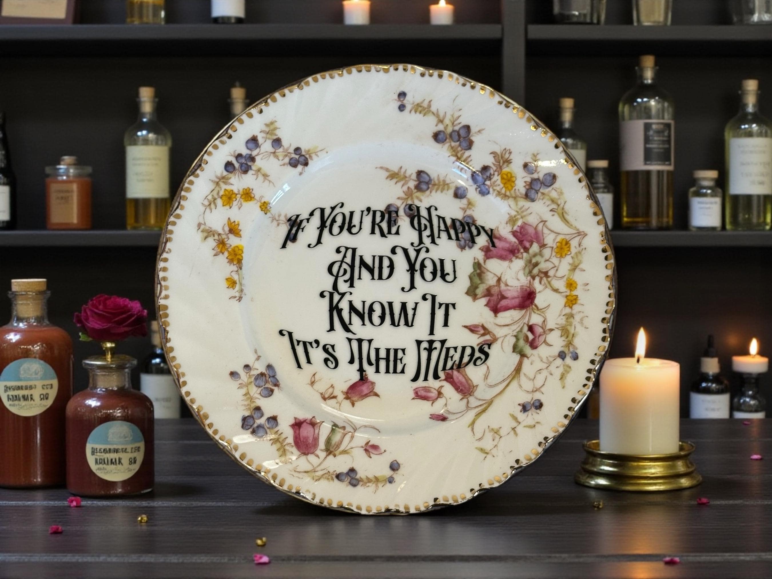 **Tags**: #MedicatedHappiness #VintagePlate #FunnyHomeDecor #SarcasticPlate #HandwashOnly #DarkHumorDecor #ChemicalJoy #FunnyKitchenDecor #MentalHealthHumor #VintageSass #MedsMakeMeHappy #FunnyDecor #SelfAwareness