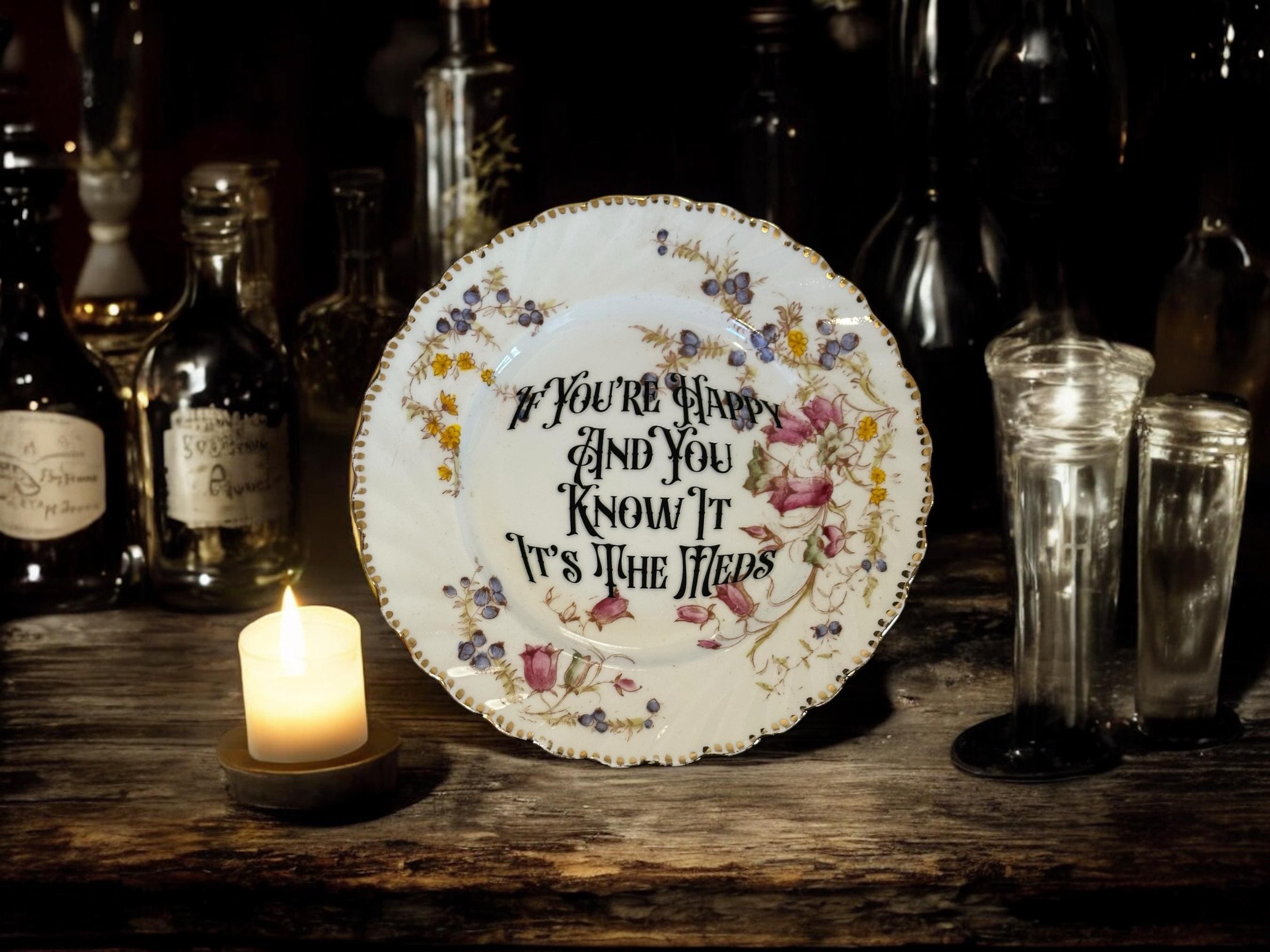 Ah, happiness. It’s a rare and fleeting thing, but sometimes, just sometimes, it’s brought to you by a tiny little pill or two. This 16cm vintage plate cuts through all the self-help nonsense and gets straight to the point: *“If you’re happy and you know it, it’s the meds.”* Because let’s be real—some of us need a little extra *chemical assistance* to survive this wild, chaotic ride we call life.