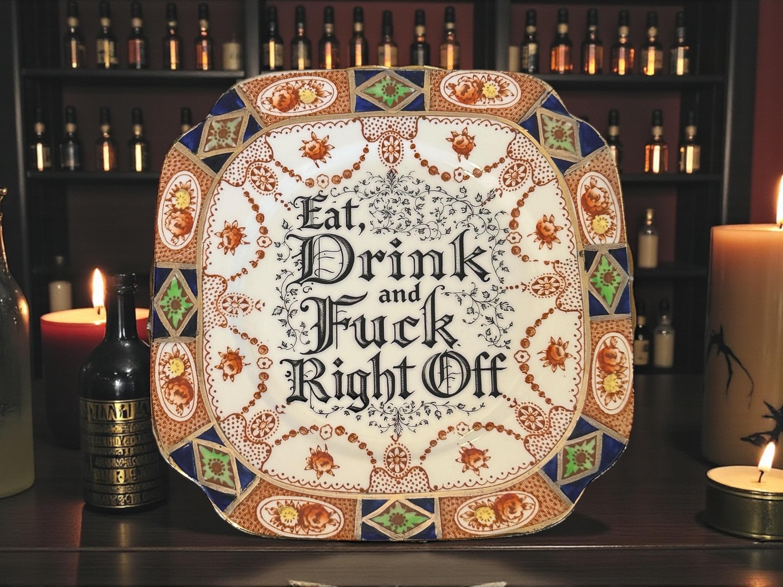 Vintage 16cm Decorative Plate with Stand – “Eat, Drink And Fuck Right Off”