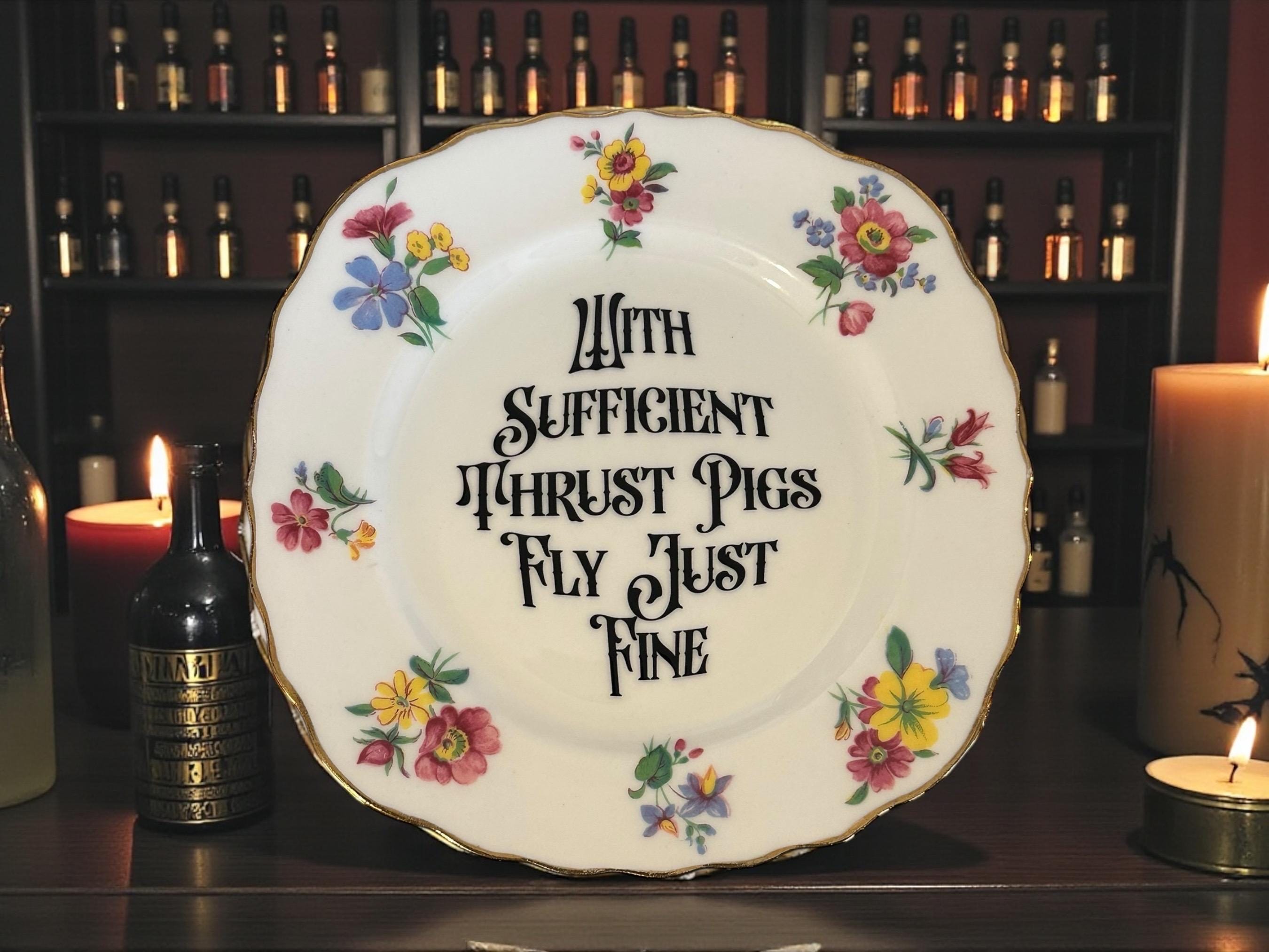 Tired of motivational quotes that pretend you’ll manifest your dreams by just *wishing really hard*? Good news — this 16cm vintage plate delivers a far more realistic pep talk. Behold: “With sufficient thrust, pigs fly just fine.” It’s a simple reminder that *anything* is possible when you’re willing to throw enough chaos, force, and questionable life choices at the problem.