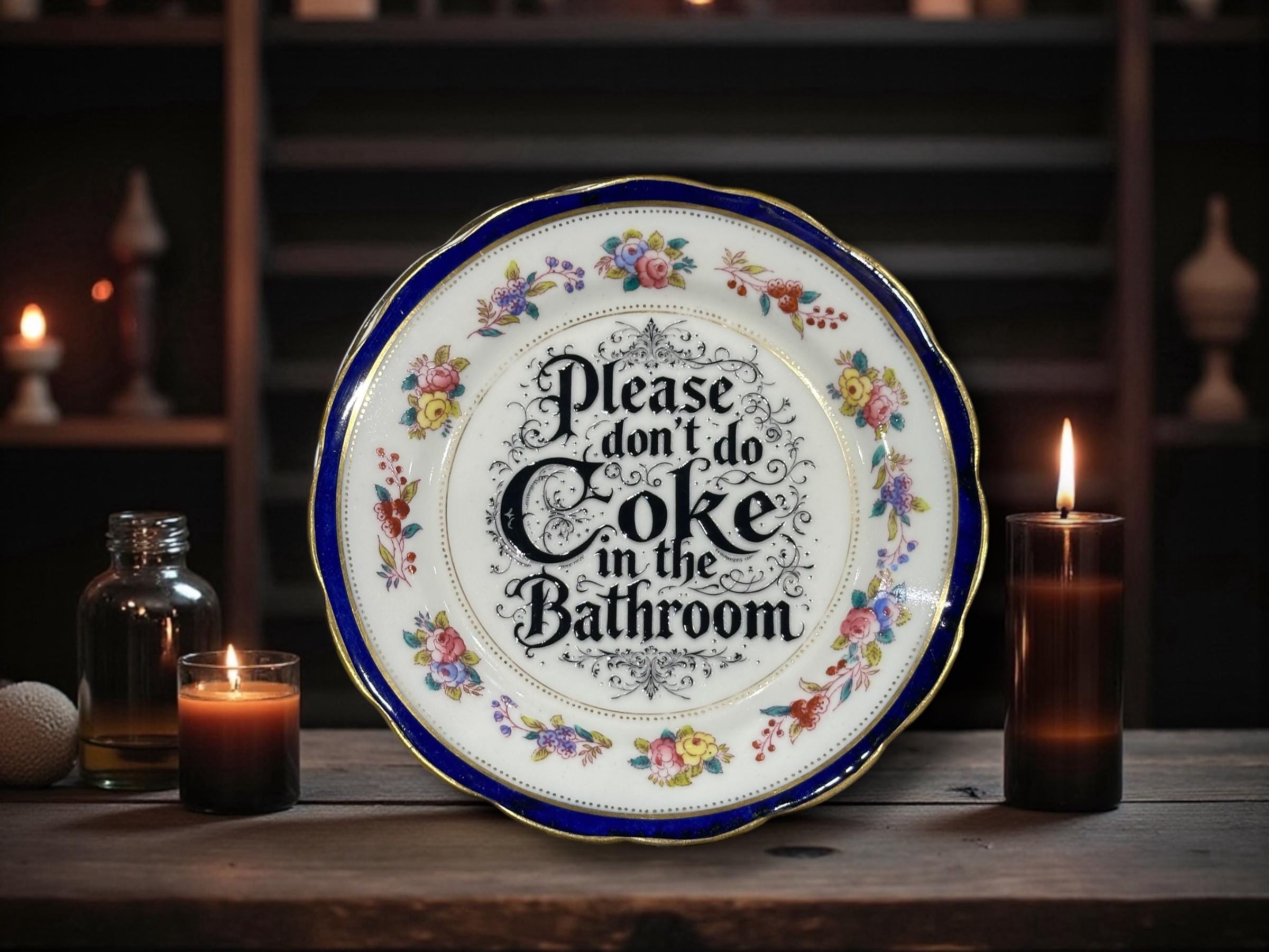 🚽 16cm “Please Don’t Do Coke in the Bathroom” Plate – Vintage Crackpottery 🚽