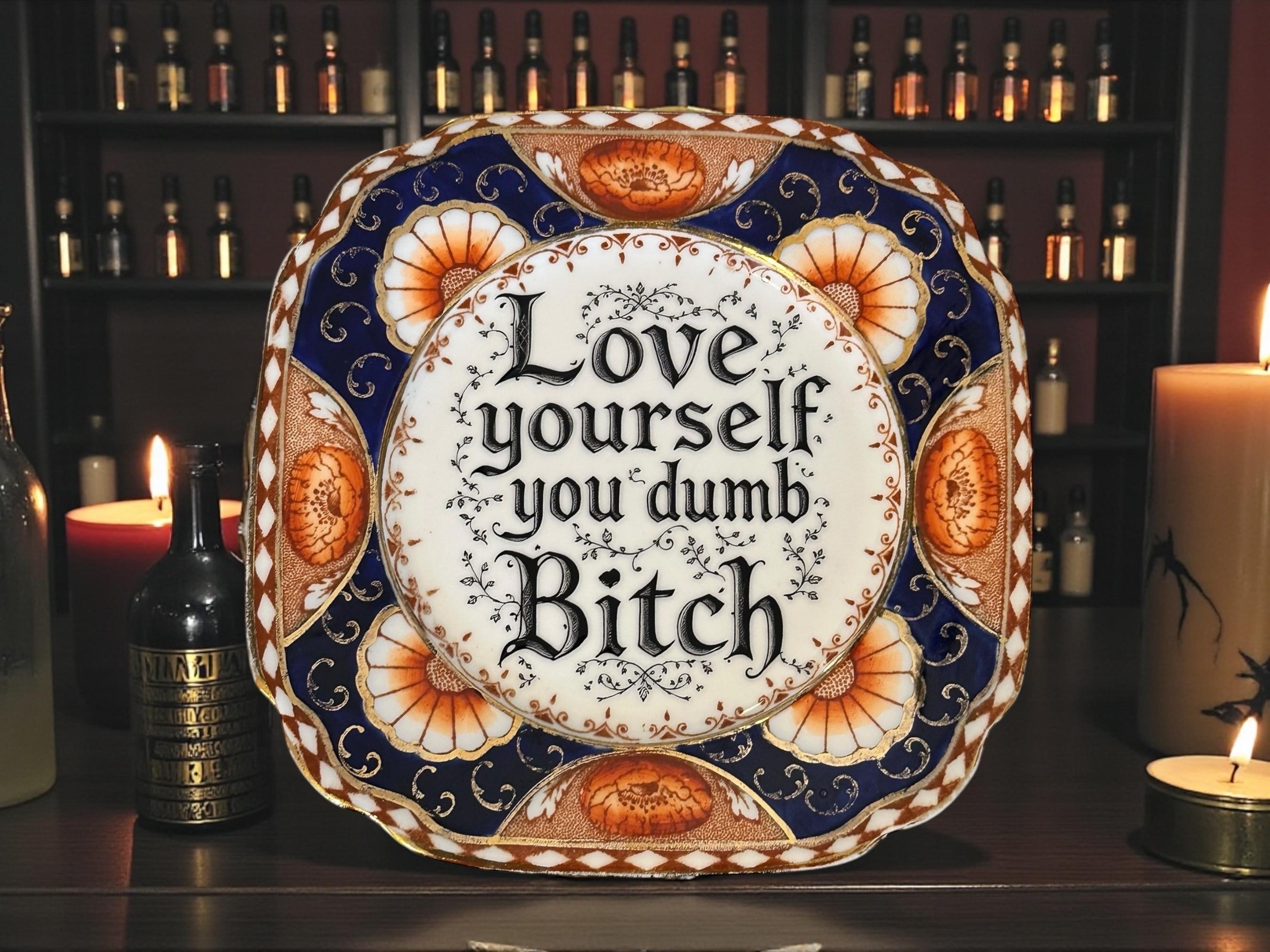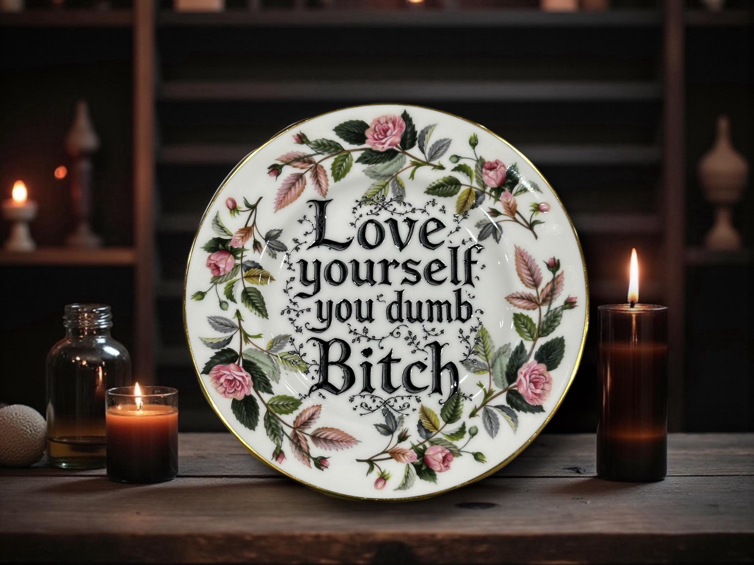 In the immortal words of every therapy session you've ever ghosted: *“Love yourself, you dumb bitch.”* This charming 16cm vintage plate is here to scream gentle affirmations at you in the kind of tone only a best friend or deeply unhinged mirror pep talk can deliver.