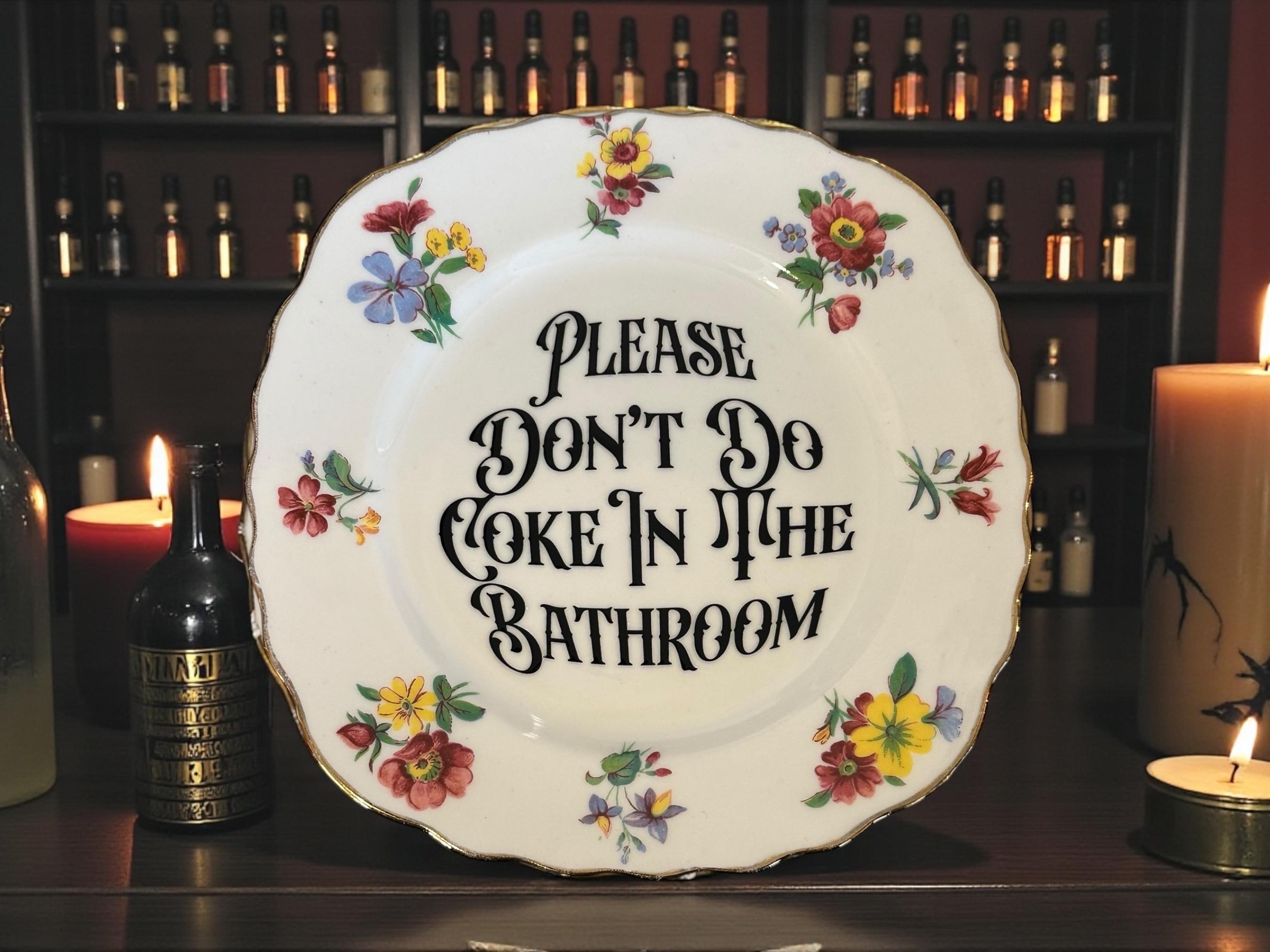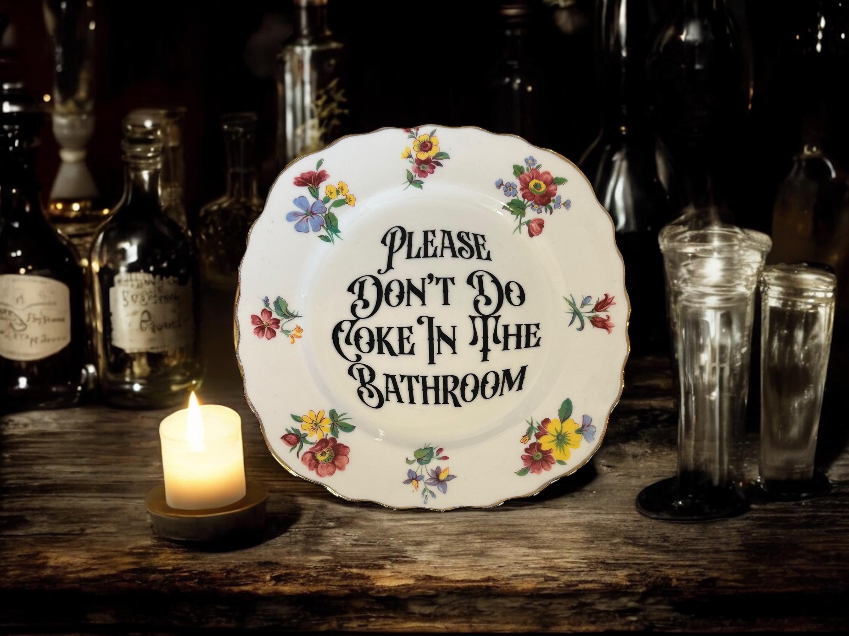 🚽 16cm “Please Don’t Do Coke in the Bathroom” Plate – Vintage Crackpottery 🚽