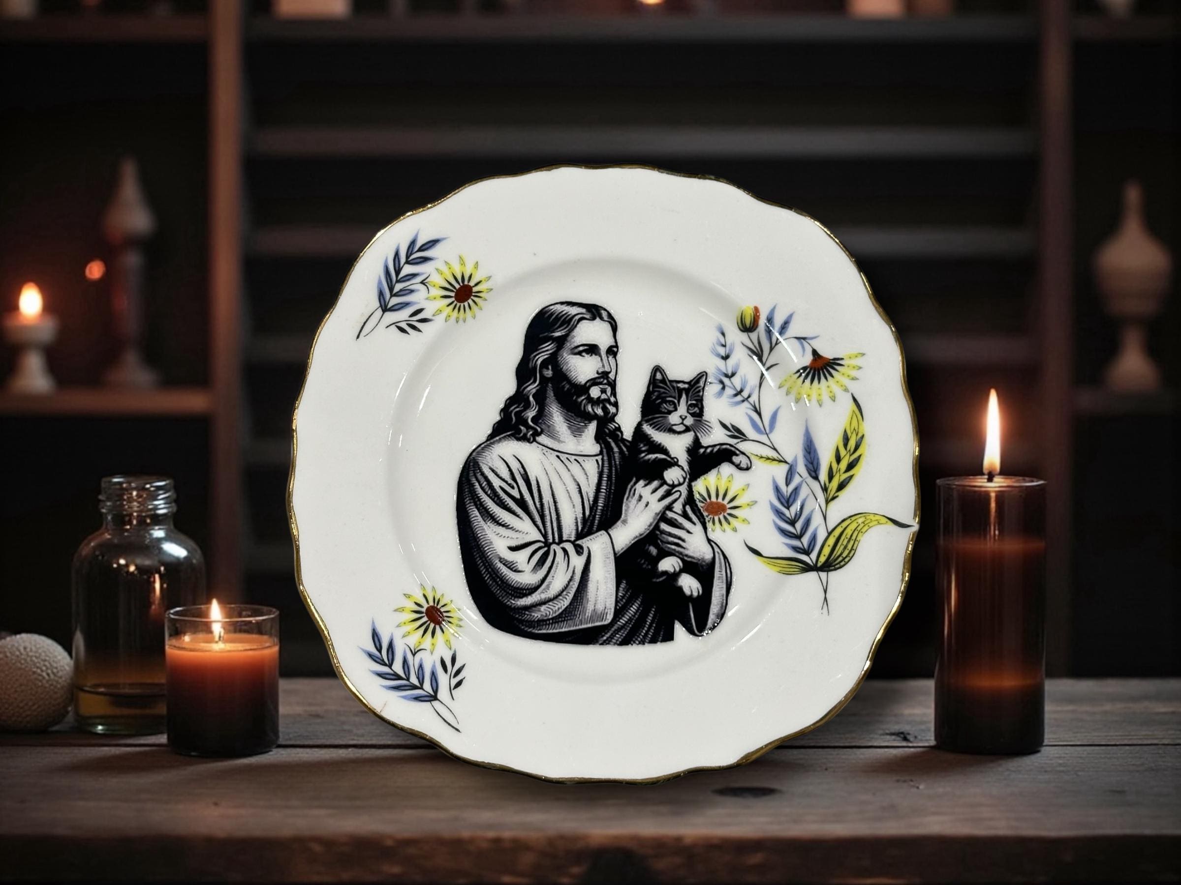 Perfect for your kitchen, living room, or as the centerpiece of your altar dedicated to both salvation and shedding. Comes with a free plate stand, because even the Son of God deserves a place to rest His cat-collecting hands.