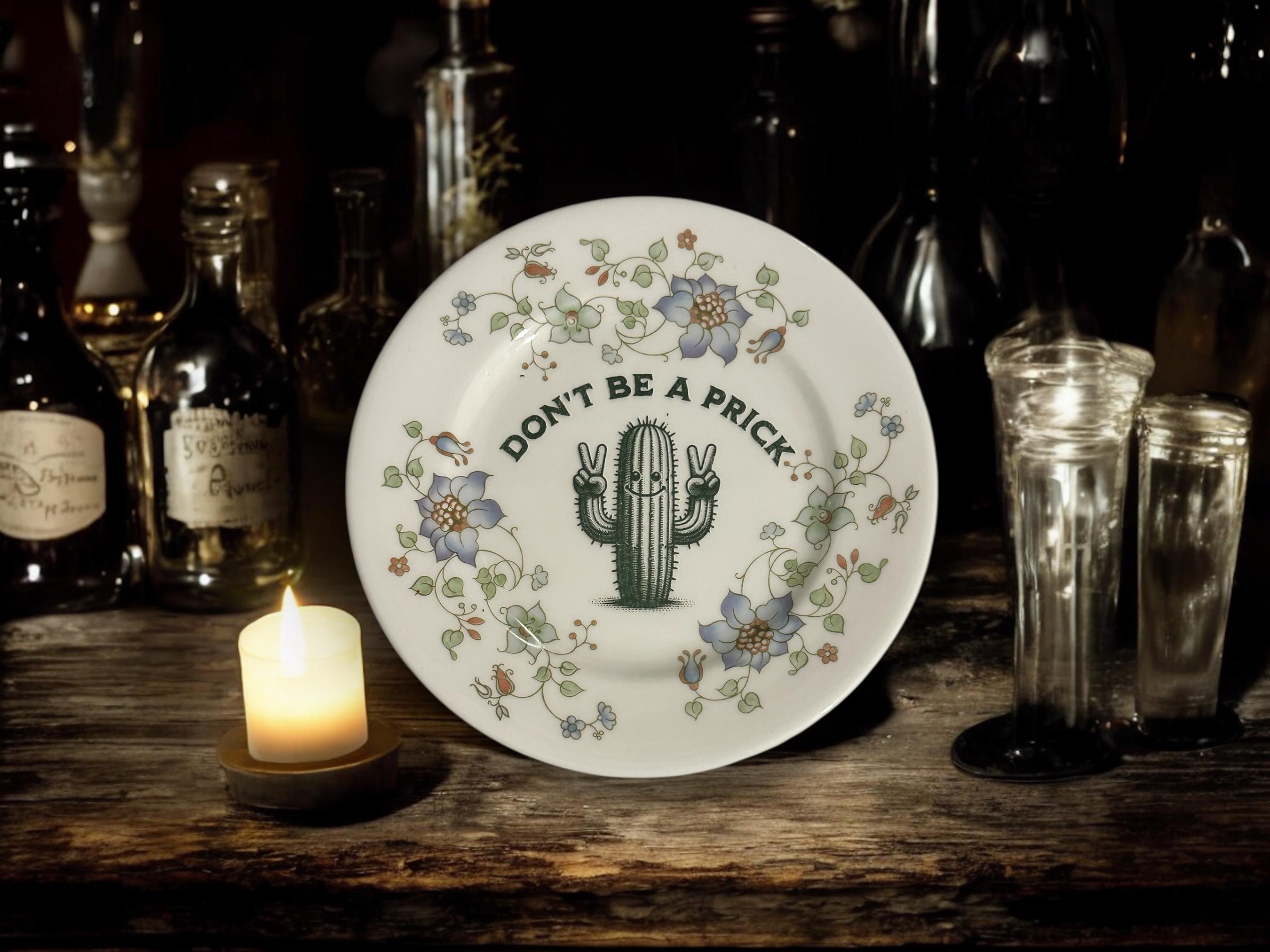 Introducing the ultimate reminder for your guests, coworkers, or that one family member who definitely needs to see this: a delightfully vintage 16cm plate boldly proclaiming “Don’t Be A Prick”, complete with a sassy cactus to drive the point home.