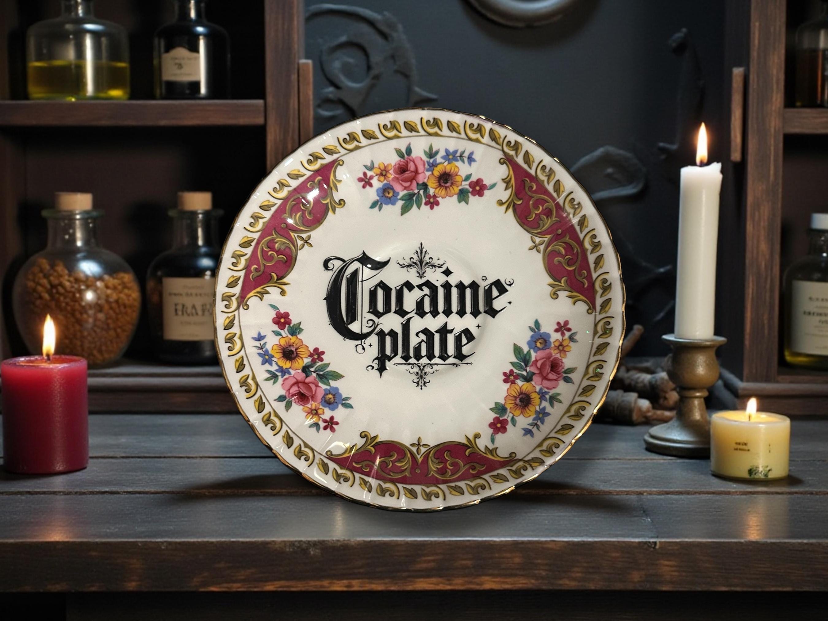 A genuine vintage saucer repurposed into a very small object with an extremely loaded word on it. Featuring “Cocaine”, delivered politely on bone china like it’s just another household item and not the opening chapter of a bad decision anthology.