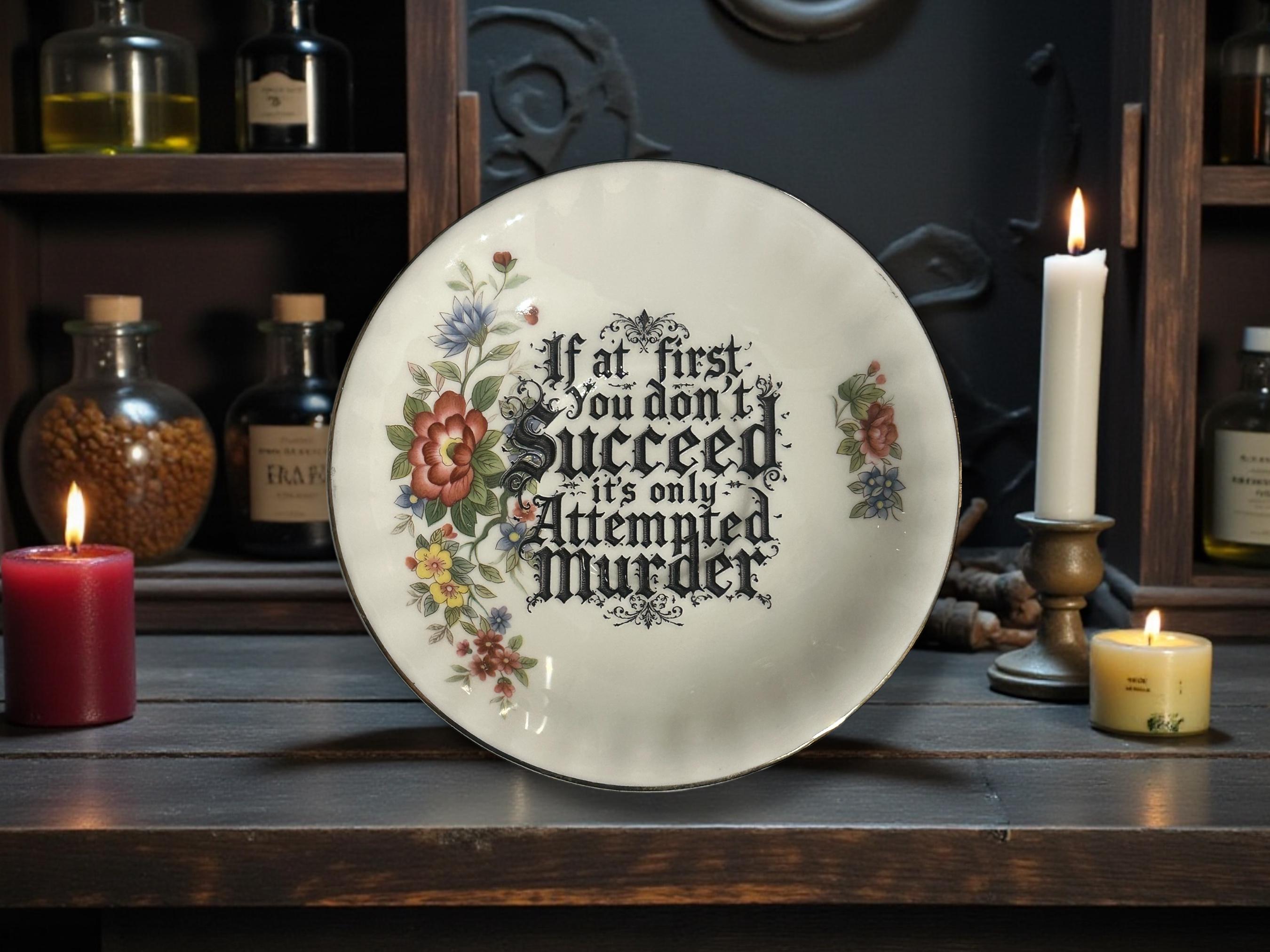 A genuine vintage saucer repurposed into an extremely bad motivational quote. Featuring the phrase “If at first you don’t succeed it’s only attempted murder”, delivered politely on bone china like this was meant to be inspiring and absolutely isn’t.