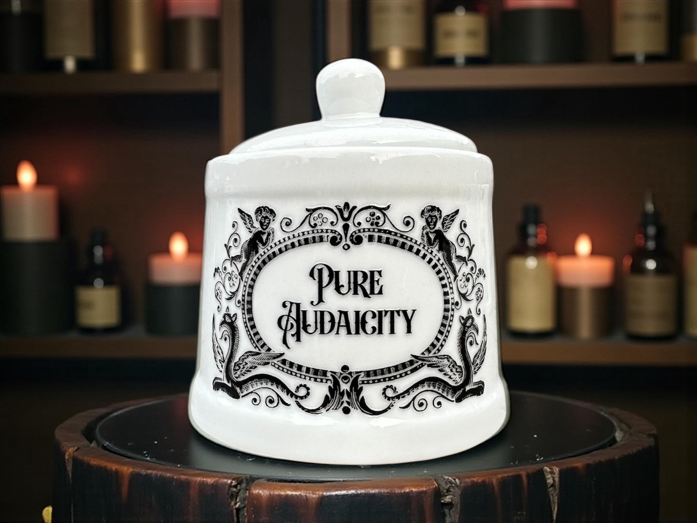 A sweet and innocent looking white ceramic jar, boldly labelled with the quality required to say that out loud and still sleep at night.
