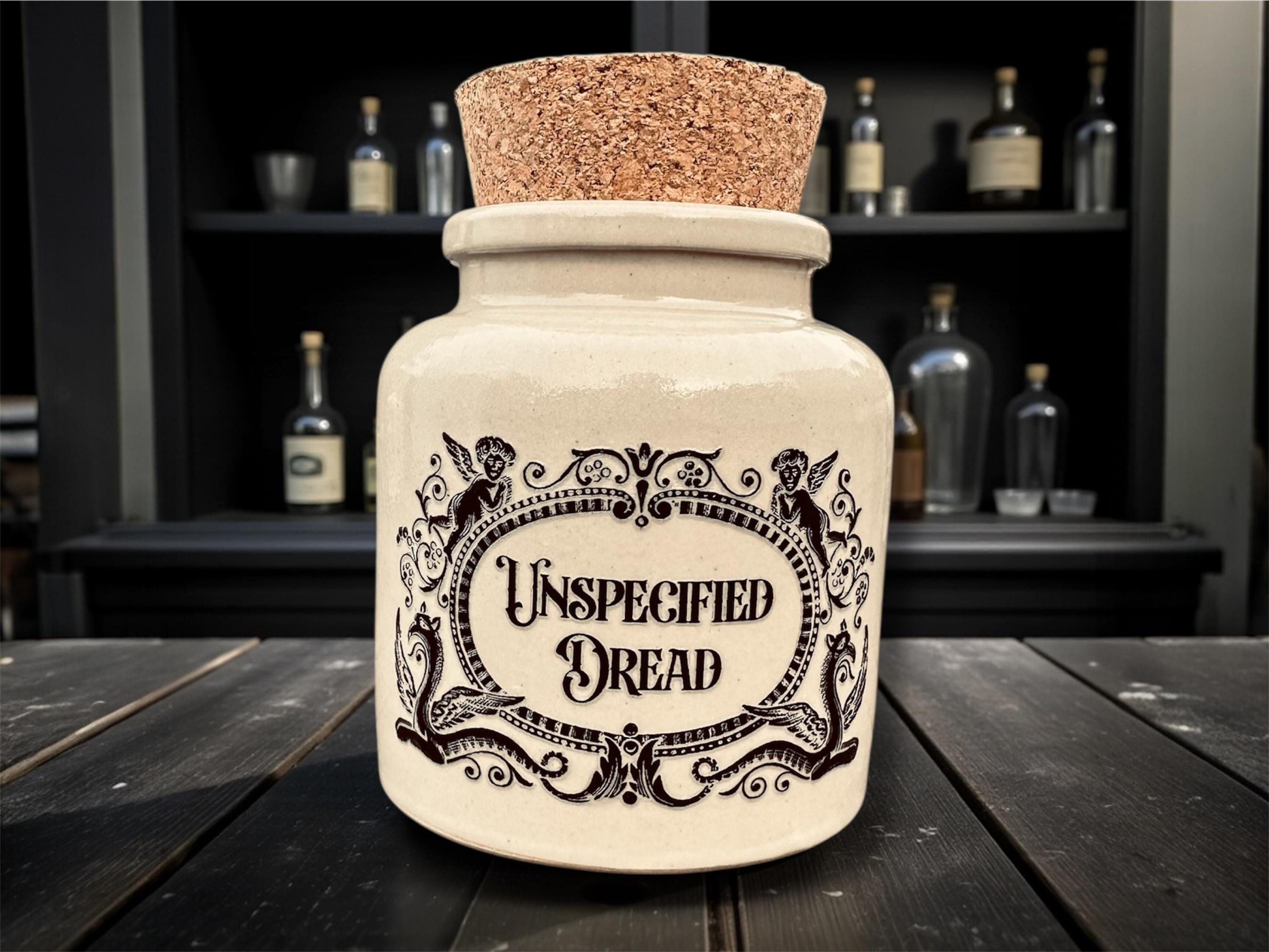 A solid stoneware jar, quietly labelled with the feeling that appears without warning, explanation, or any intention of leaving soon.