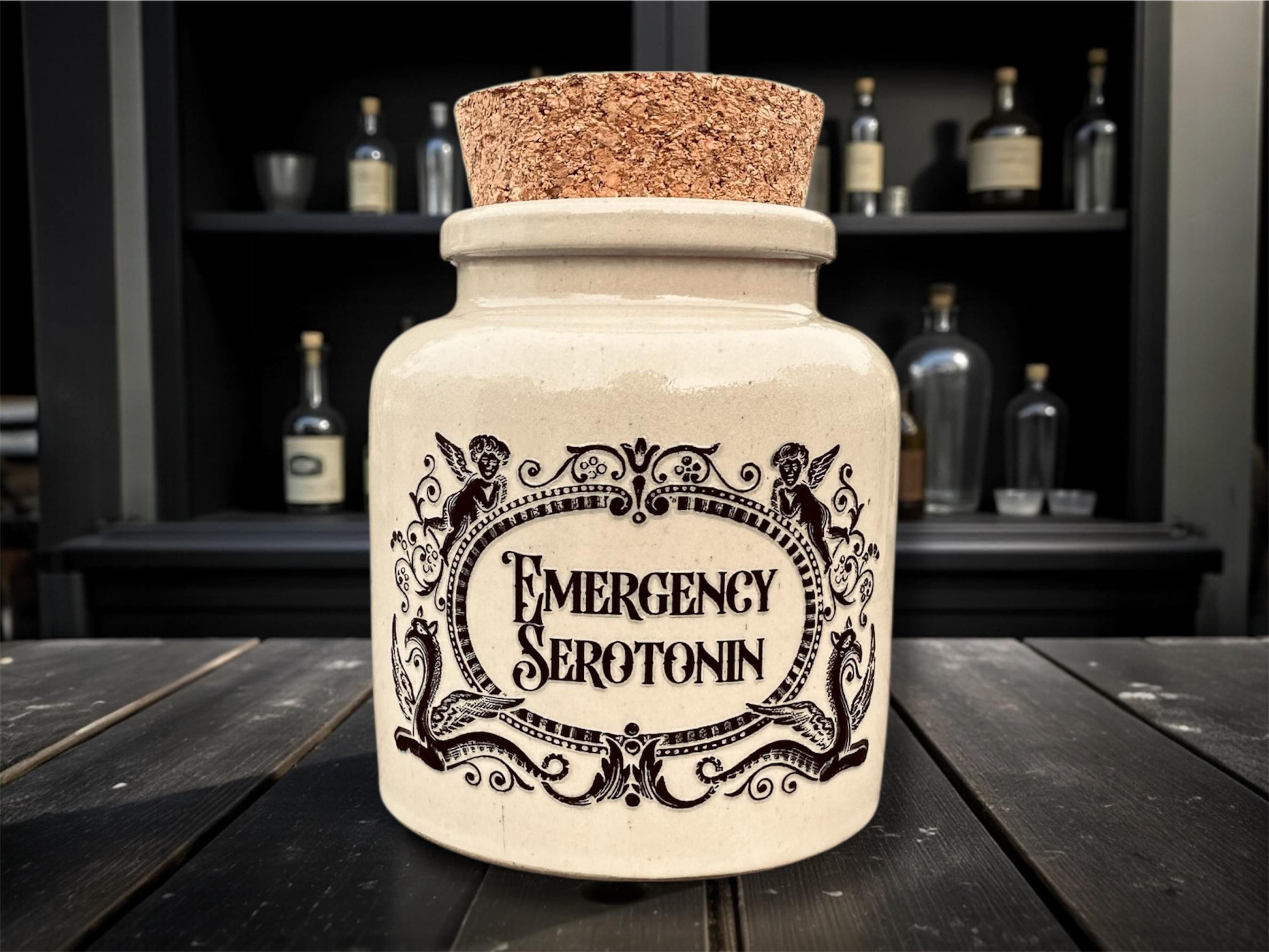 A solid stoneware jar, urgently labelled for moments when your mood collapses without warning and you require immediate emotional intervention.