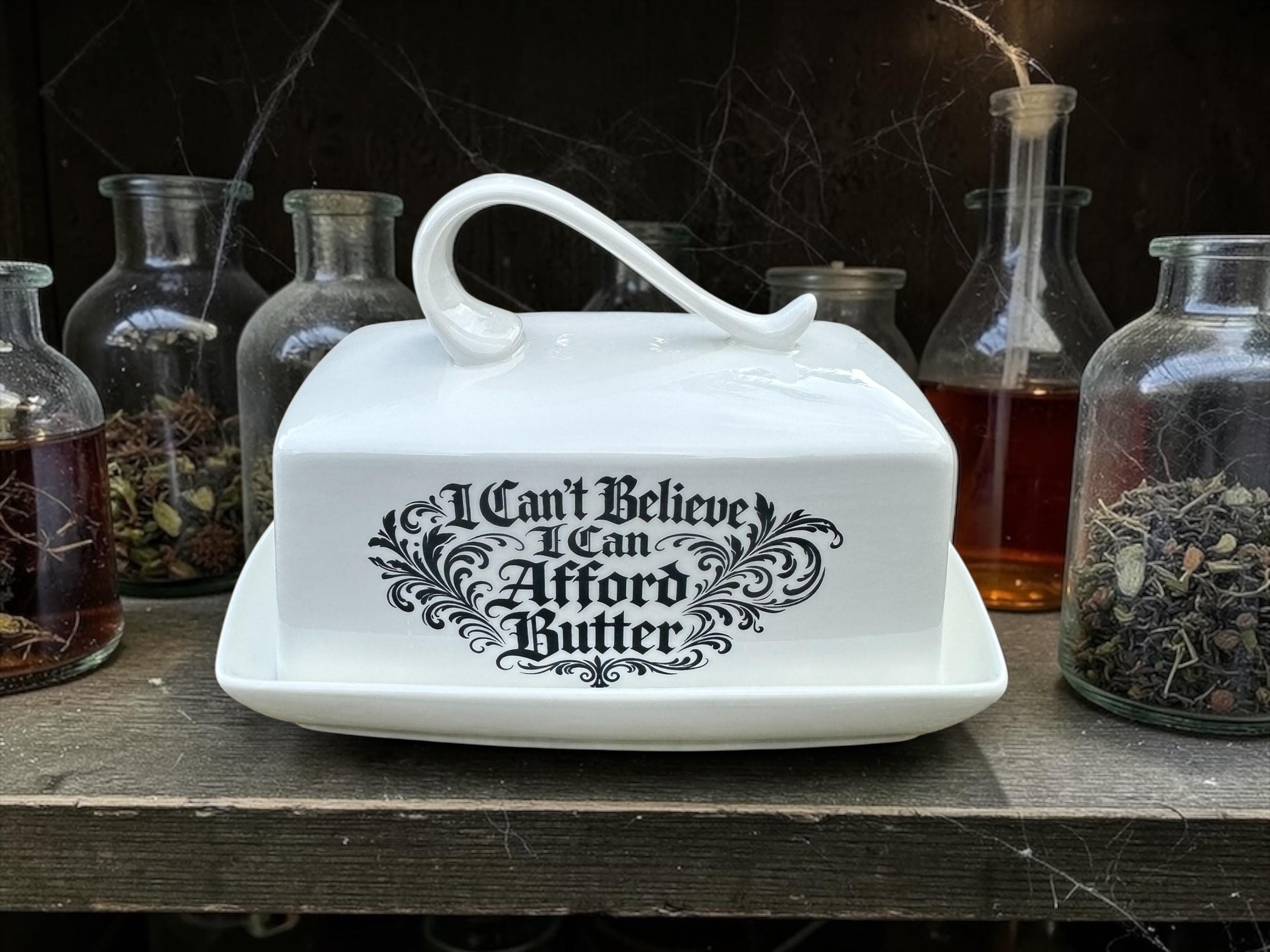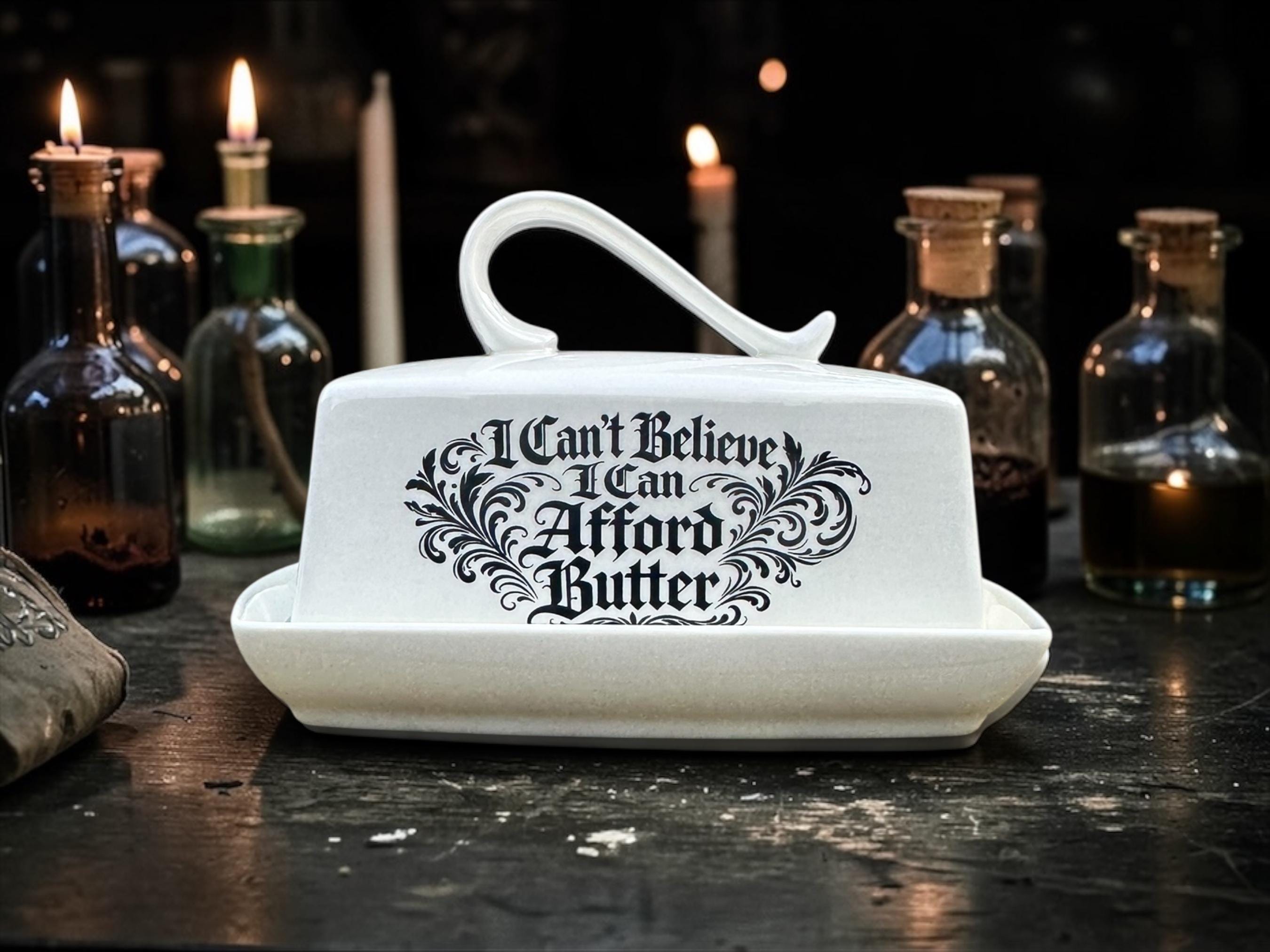 This ceramic butter dish proudly states “I Can’t Believe I Can Afford Butter”, which feels less like a joke these days and more like a financial achievement worth displaying on the kitchen counter.