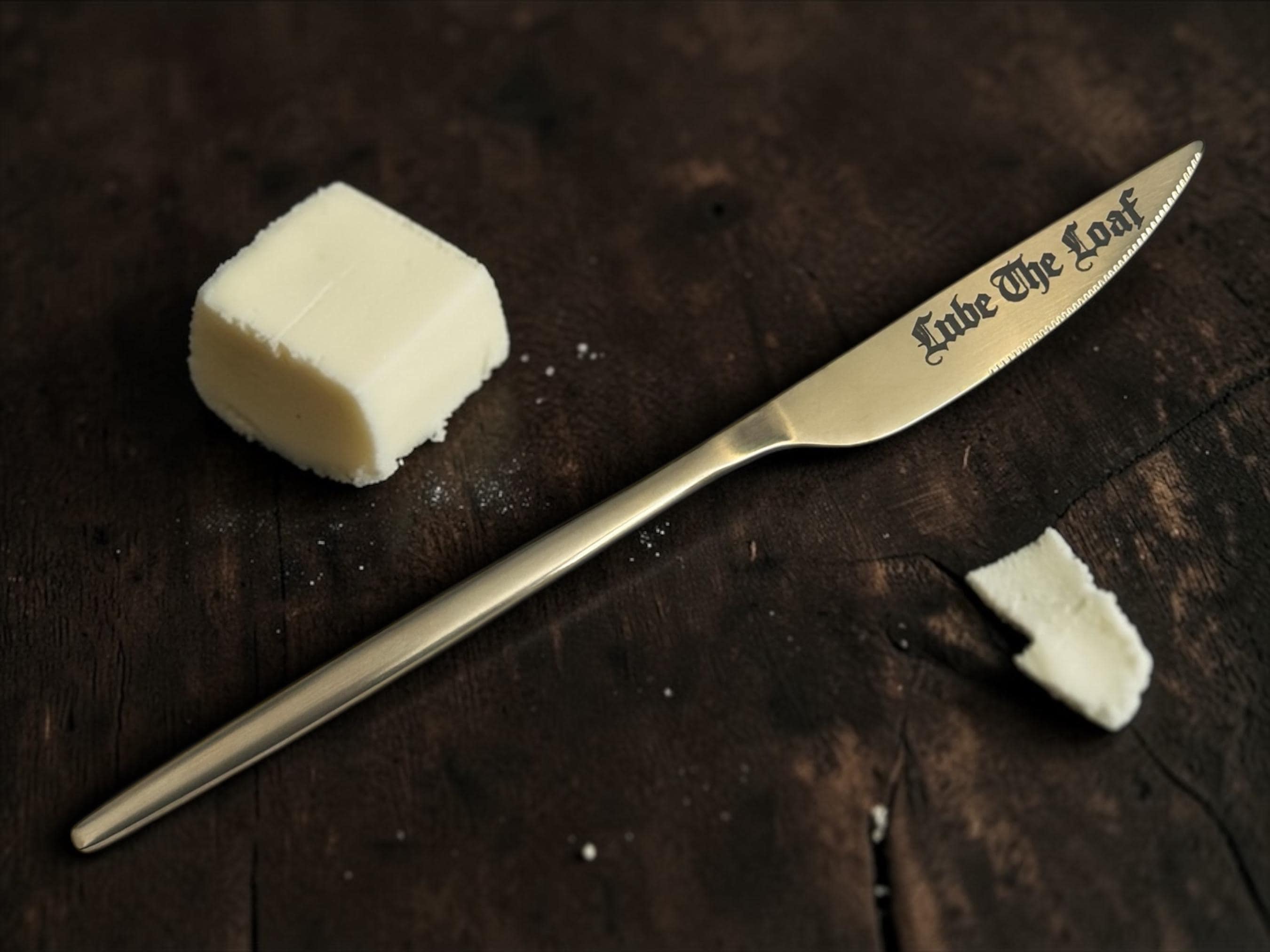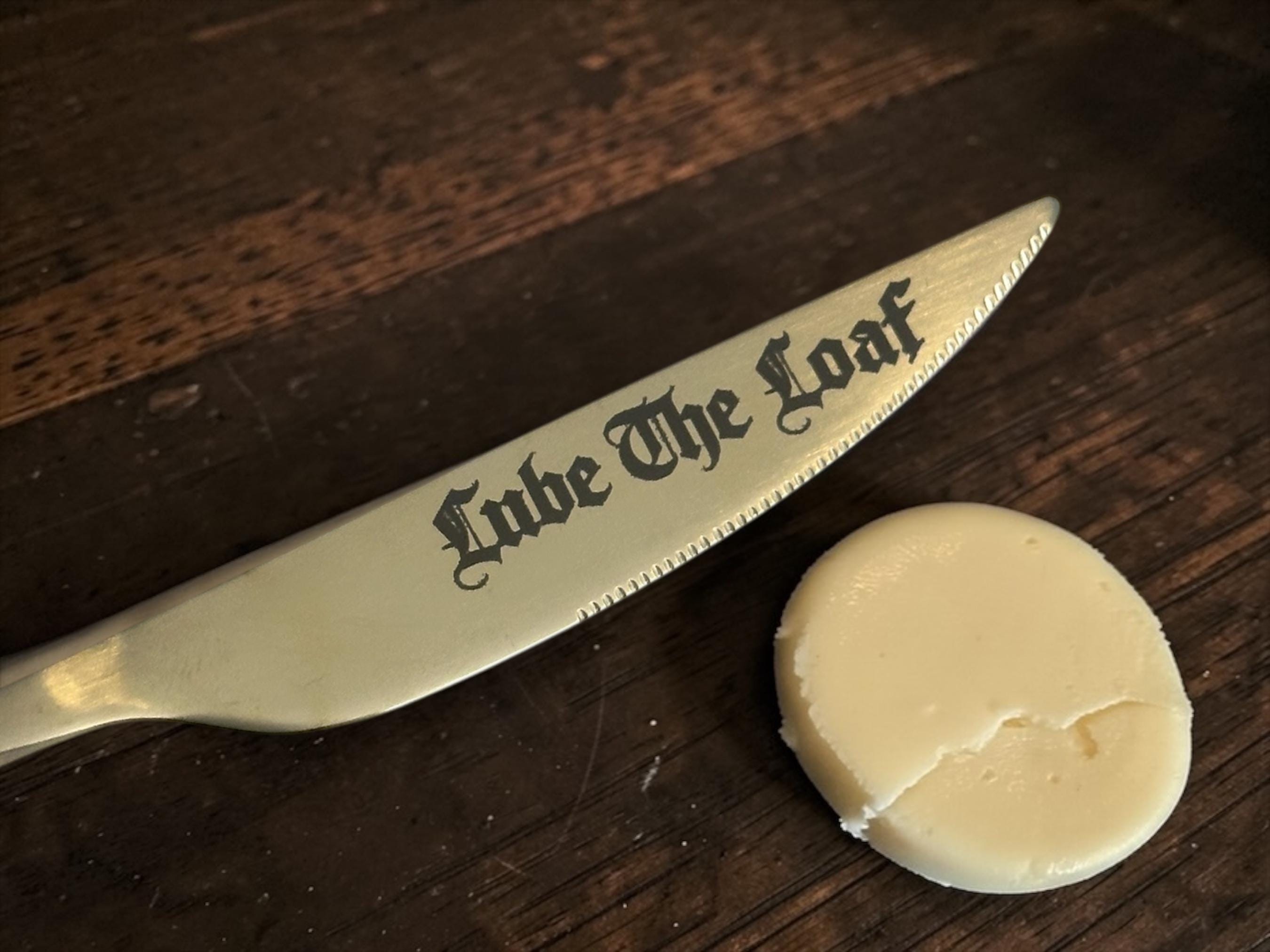 This brushed gold stainless steel butter knife has been permanently engraved with the phrase “Lube the Loaf”, because breakfast clearly needed a little more chaos.