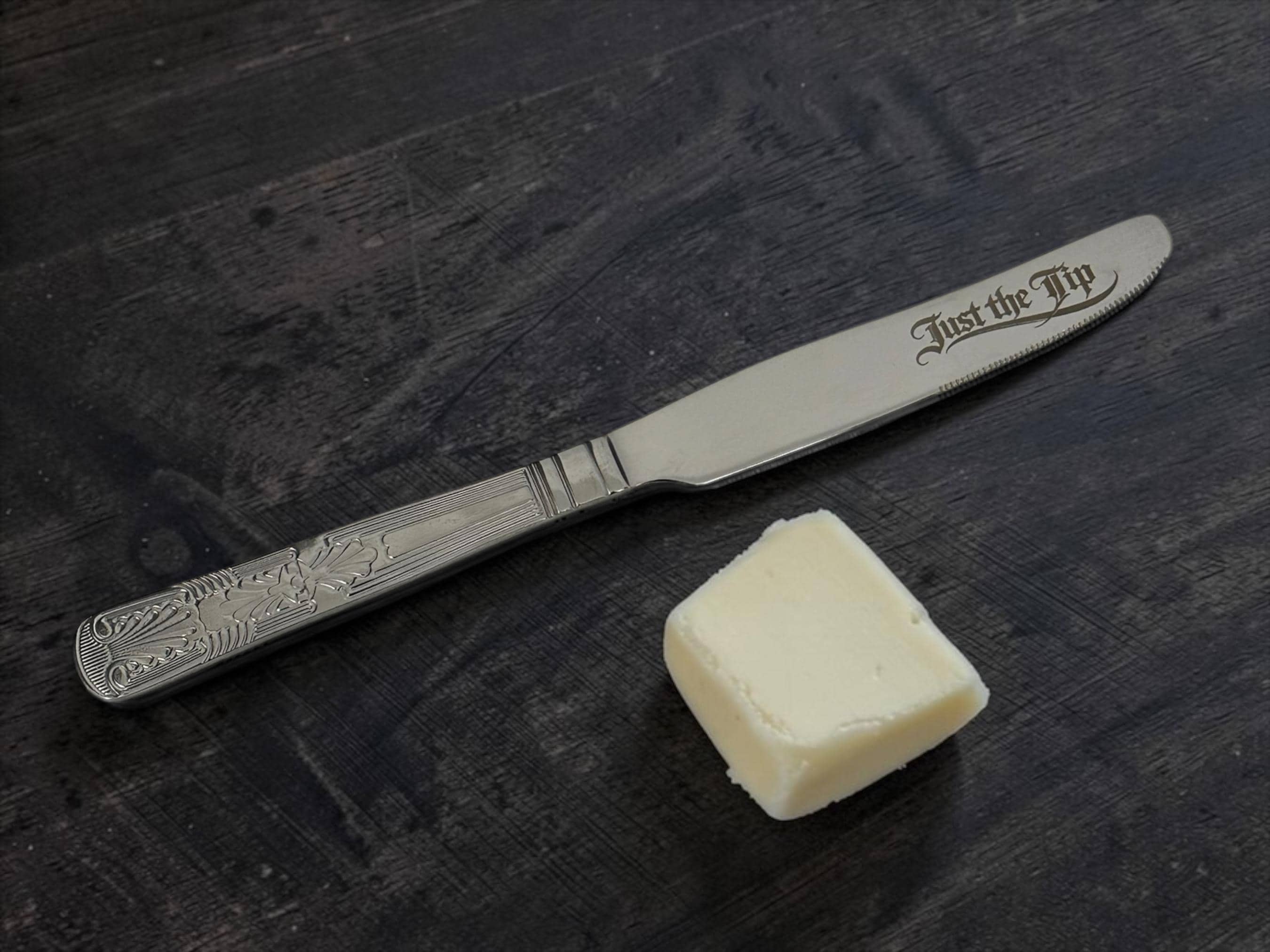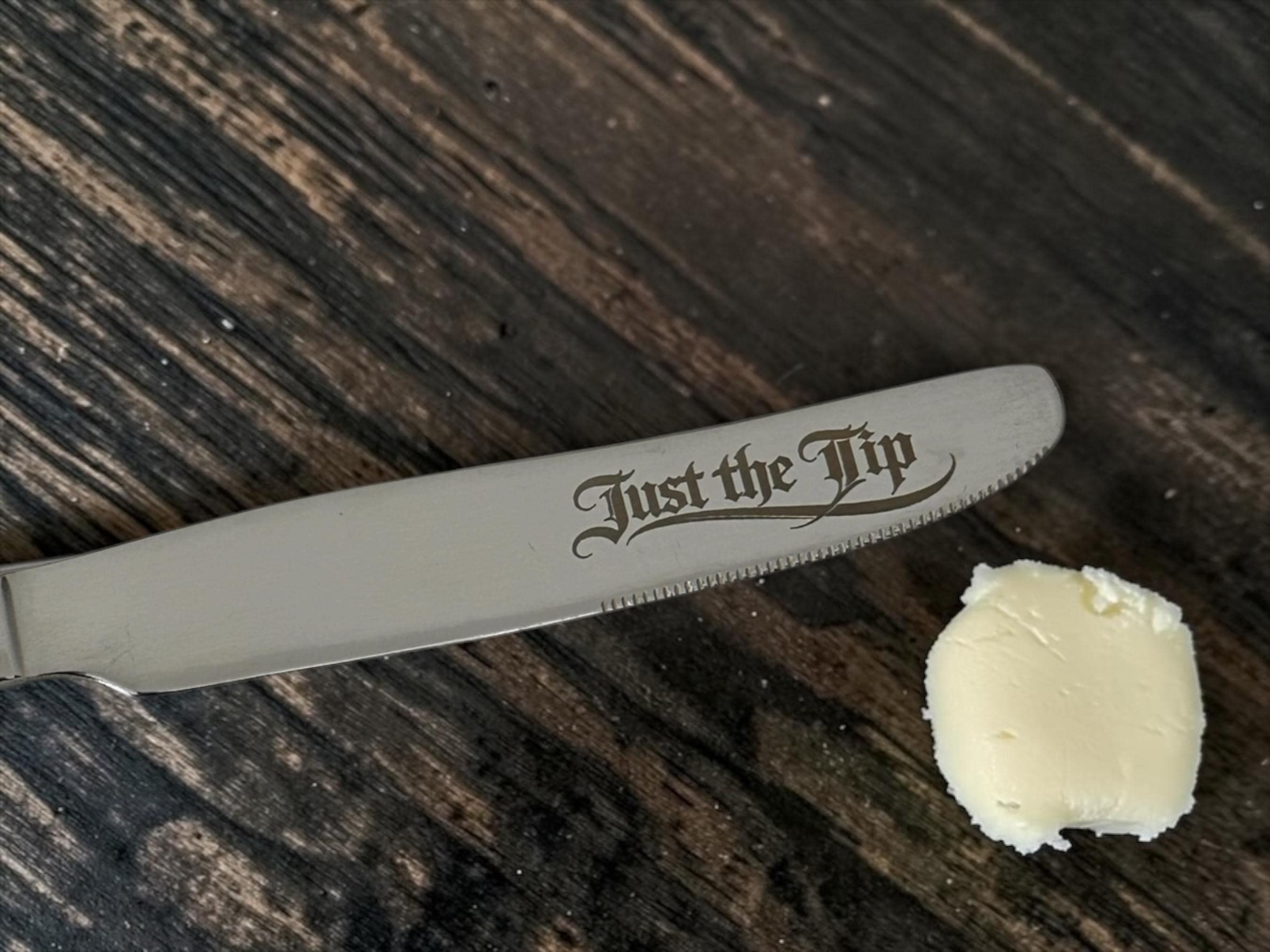 This brushed gold stainless steel butter knife has been permanently engraved with the phrase “Just The Tip”, because breakfast clearly needed a little more chaos.