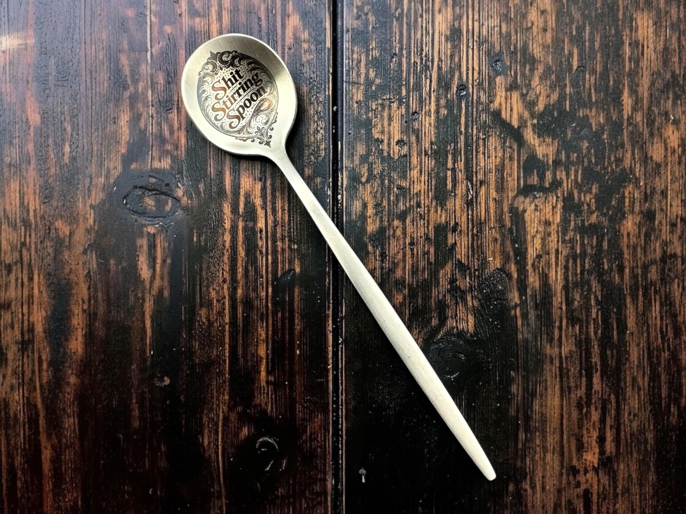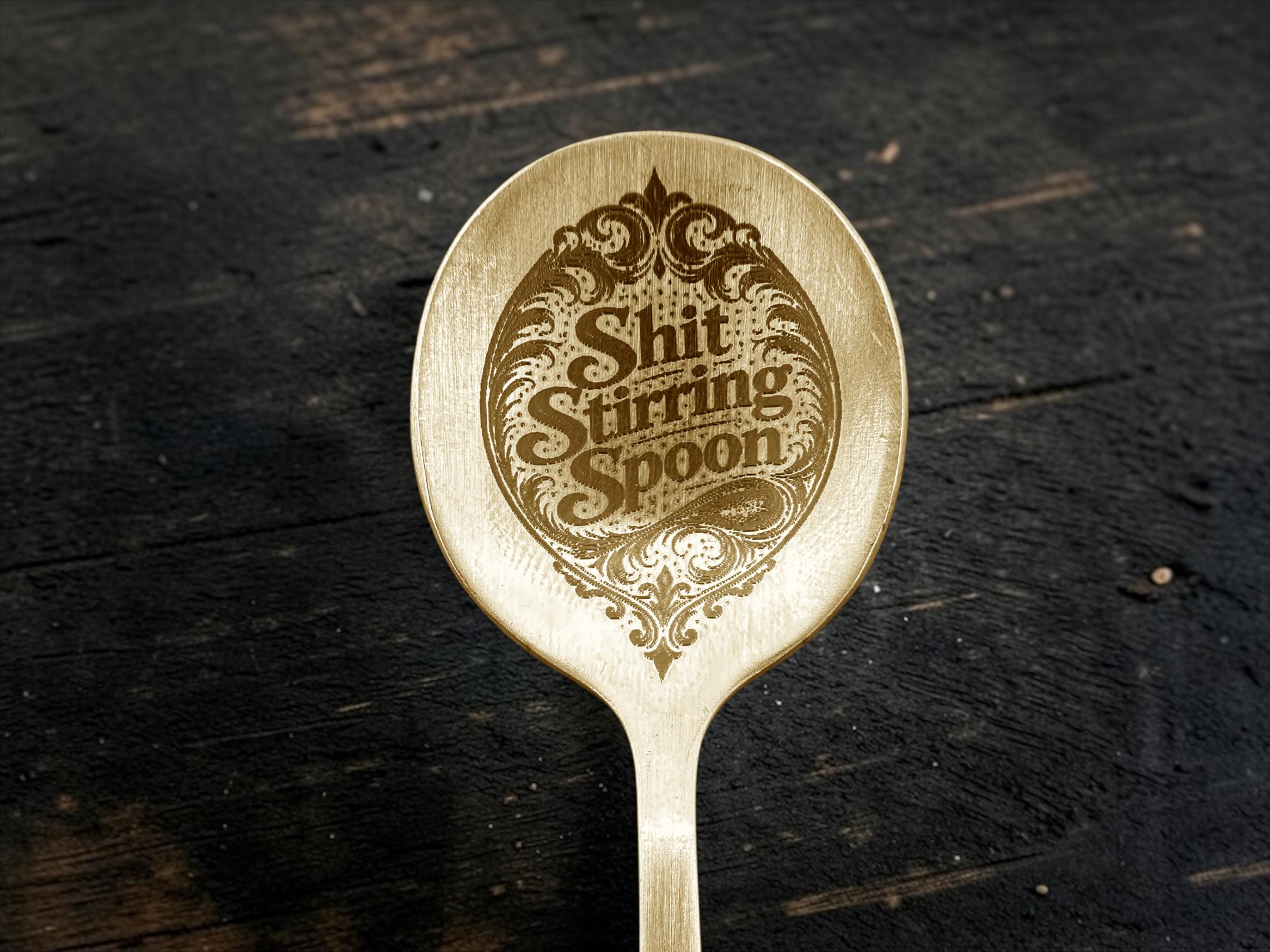 “SHIT STIRRING SPOON” engraved on a perfectly respectable brushed gold teaspoon, because sometimes subtlety is overrated and chaos deserves proper equipment.