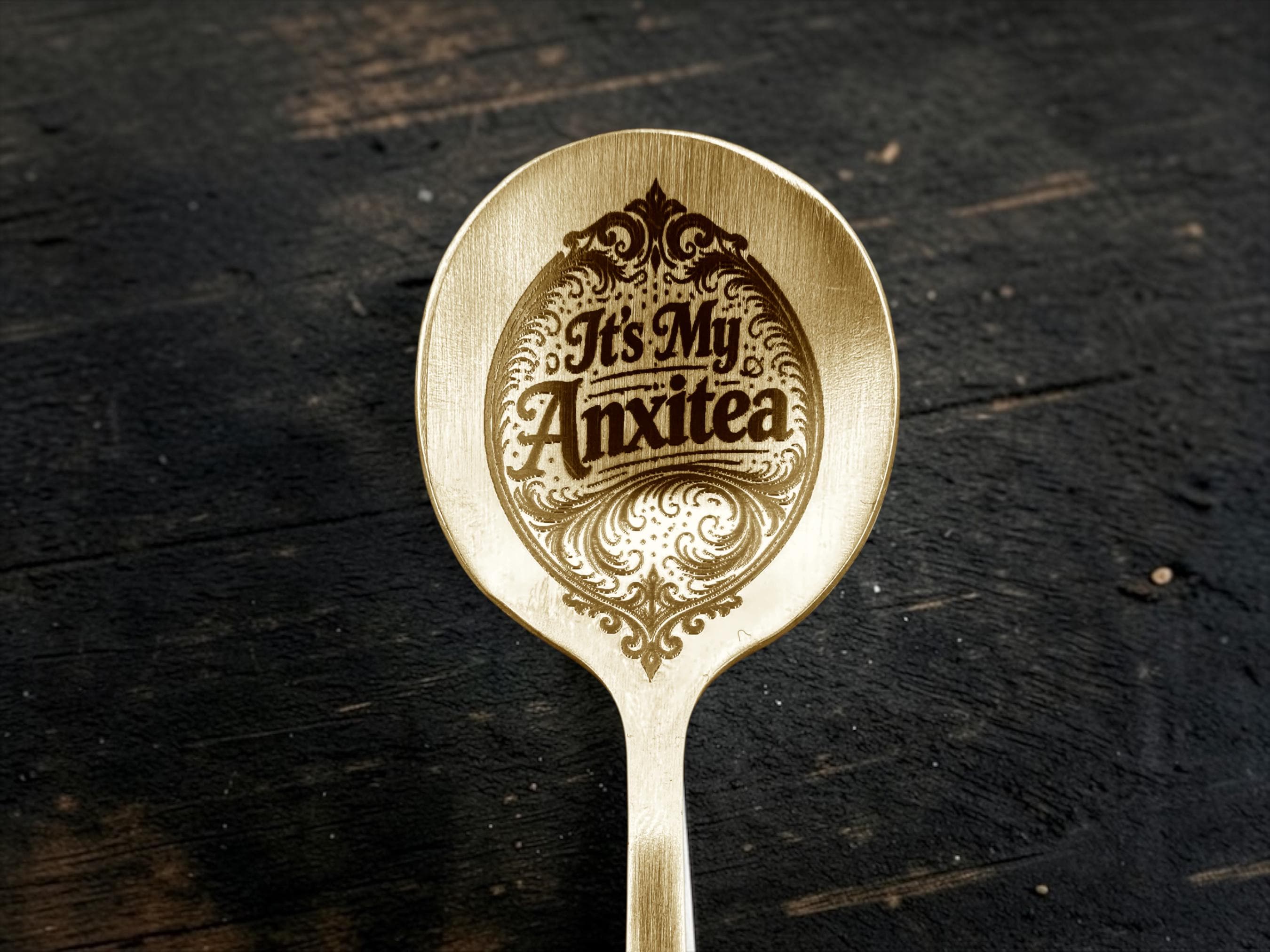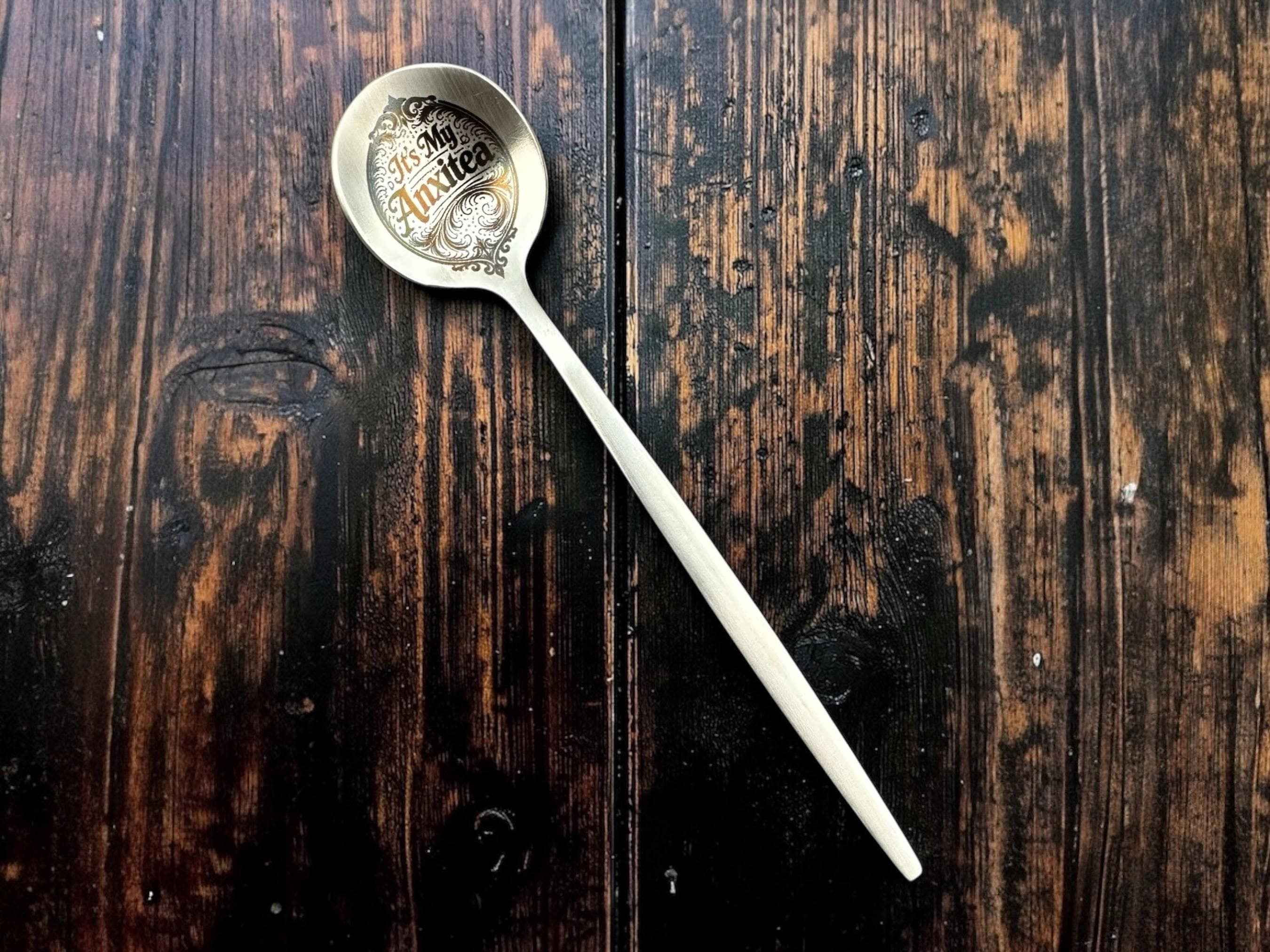 “IT’S MY ANXITEA” engraved on a calm, elegant brushed gold spoon that absolutely does not match the internal chaos it represents.